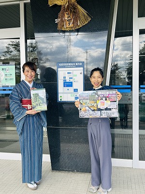 松阪駅の今井駅長さんと服部助役さん、堤原主任と松阪市観光協会岡本専務理事と誘客広報委員会委員長であるワタシぴーちゃんが市長さんにお時間をいただき、「さわやかウォーキング」松阪コースのご紹介。