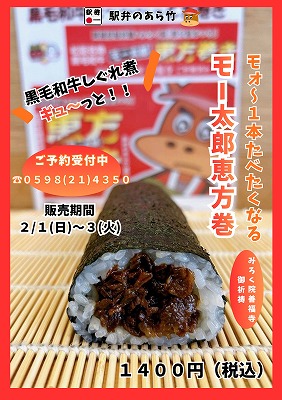 ☆2月1日(日)〜3日(火) 「開運招福モー太郎恵方巻」を予約販売 1本:1400円 (税込み) 販売場所:あら竹本店、松阪駅あら竹売店 (通販は2月2日・3日の到着日に限定)