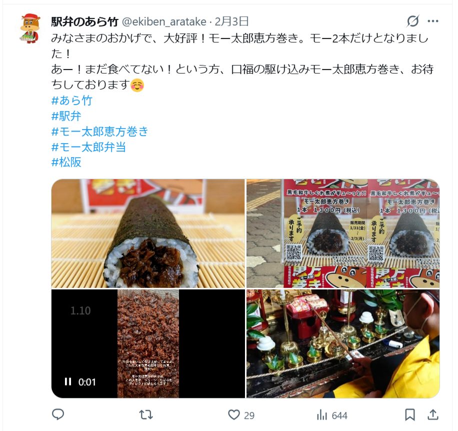 ぴーちゃんレポートはこちら https://www.ekiben-aratake.com/ibentojilyouhou/2025/0131-0203-ehoumaki/index.html
