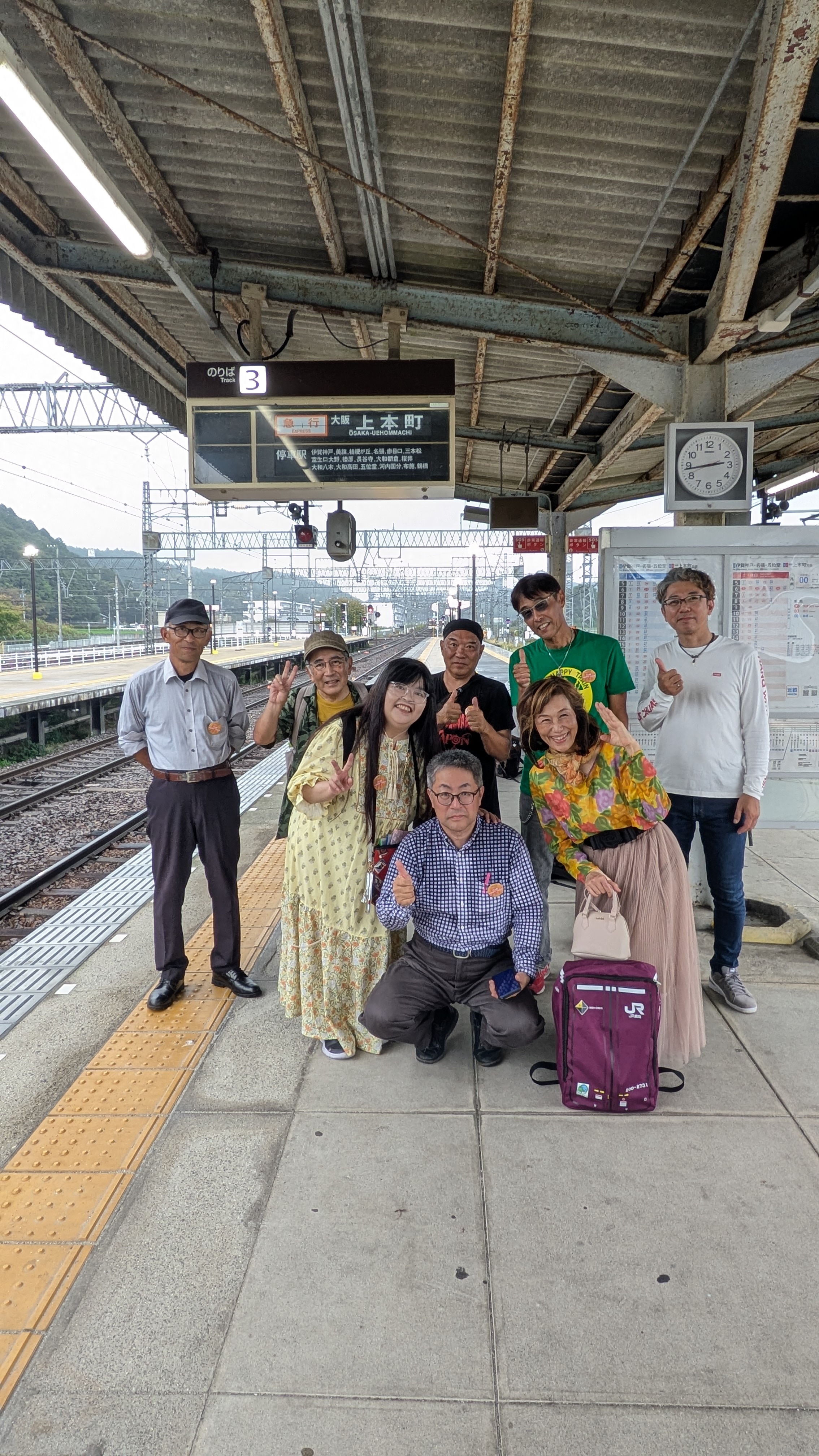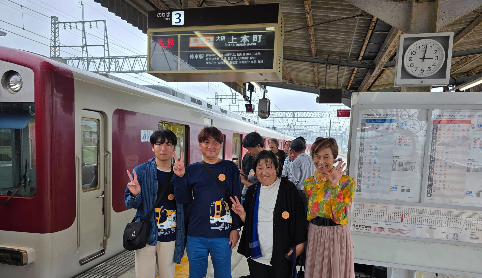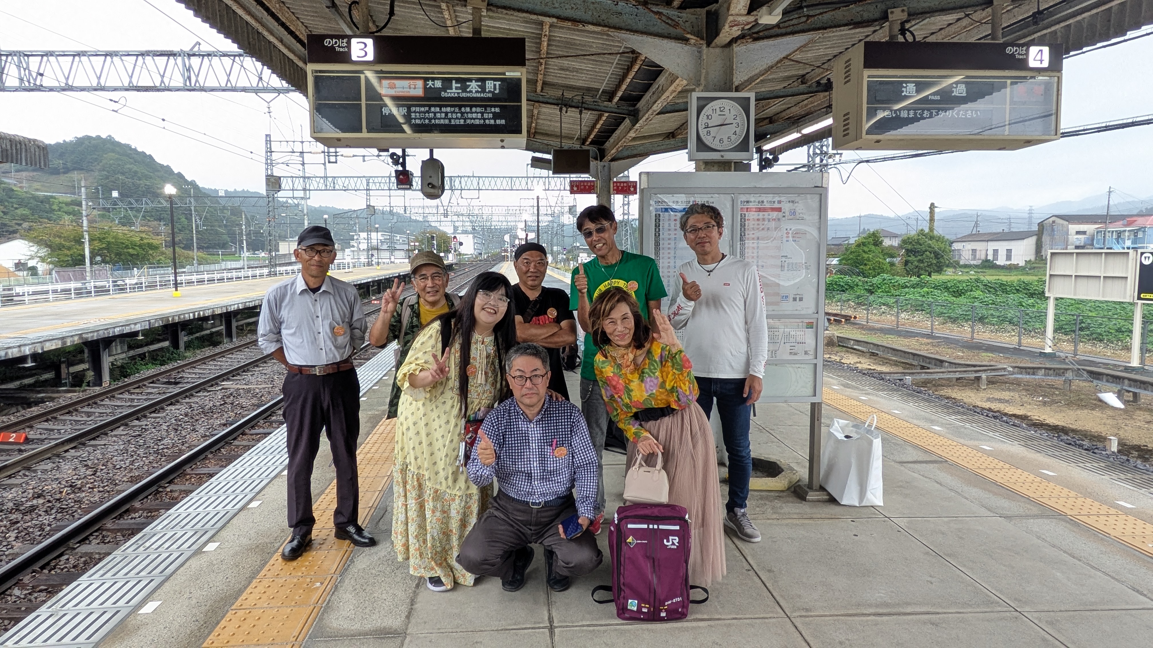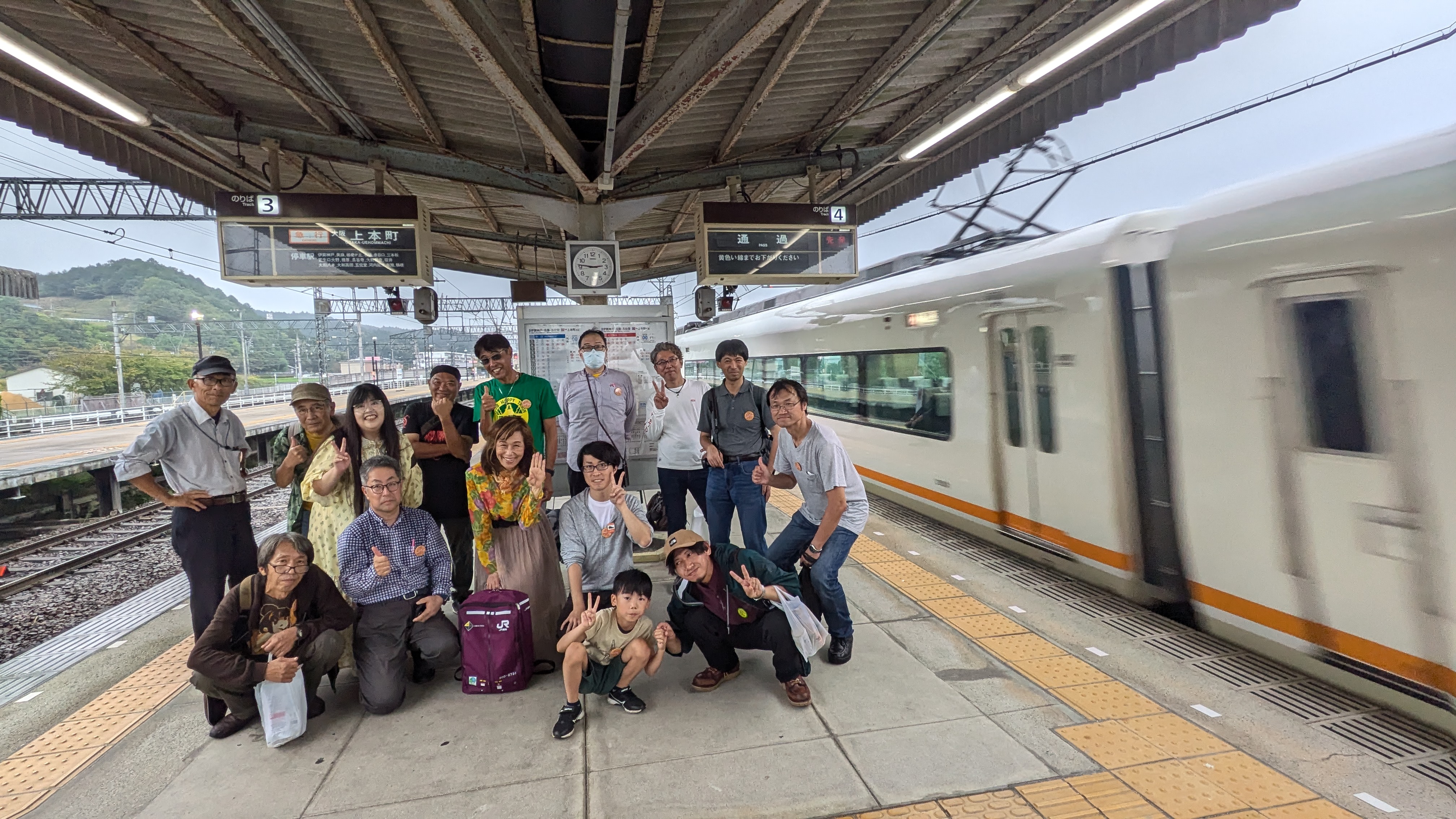 56人の皆様と全員は難しかったですが、たくさん記念写真を撮って、雨になった青山町駅で「楽」をお見送り。