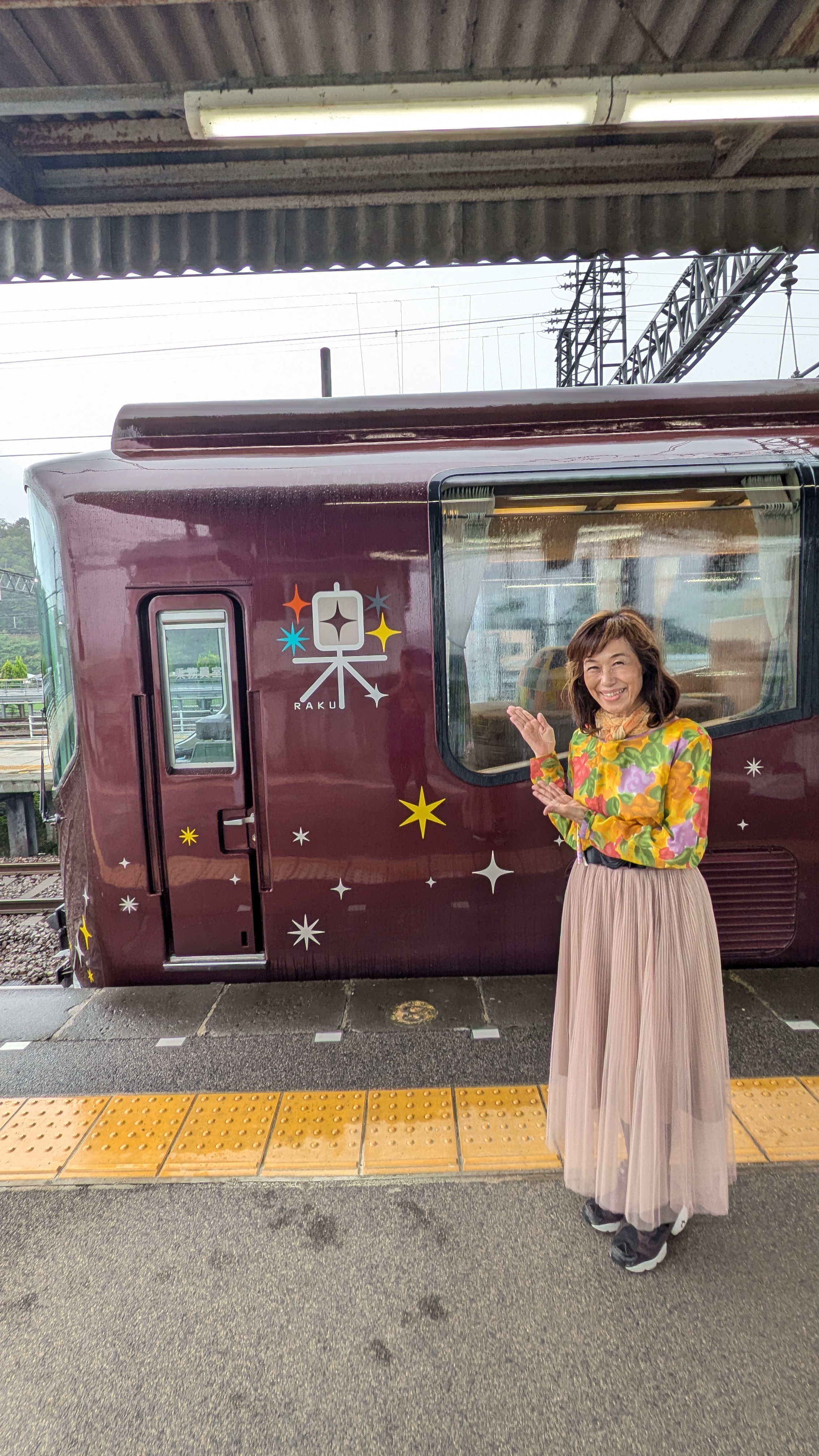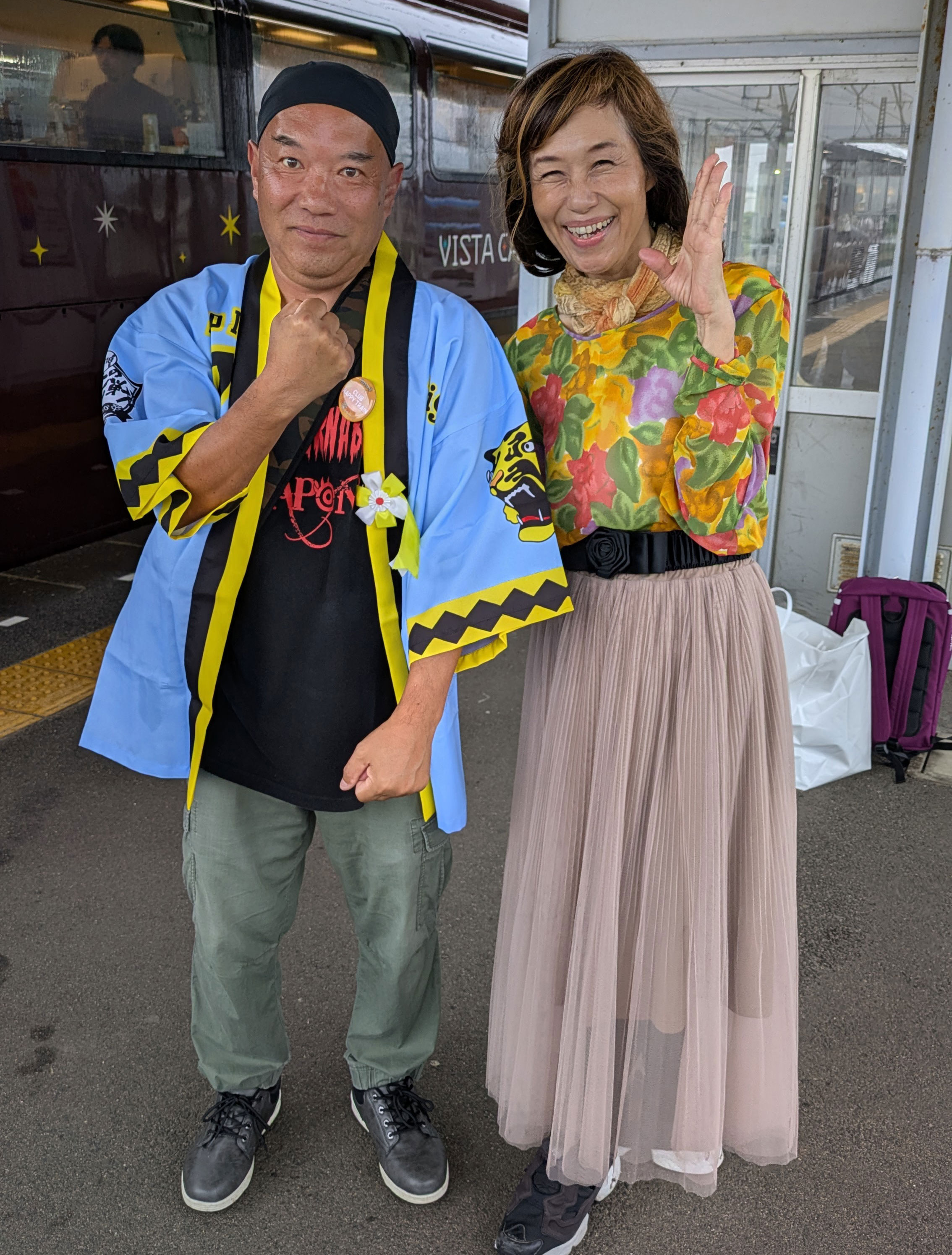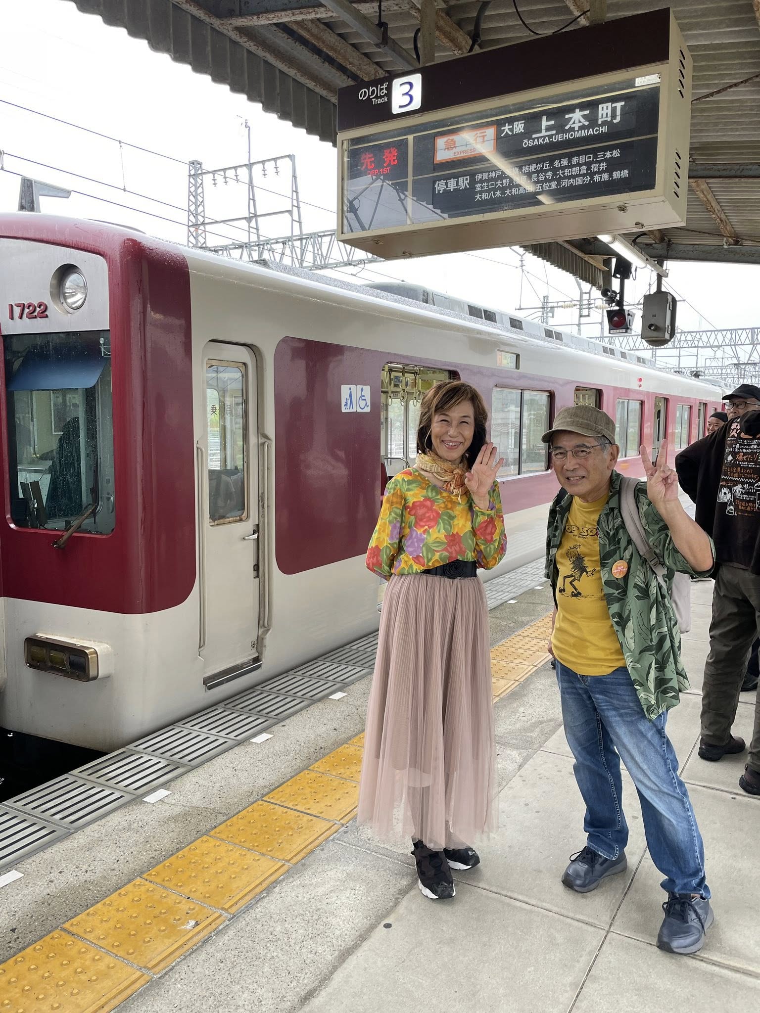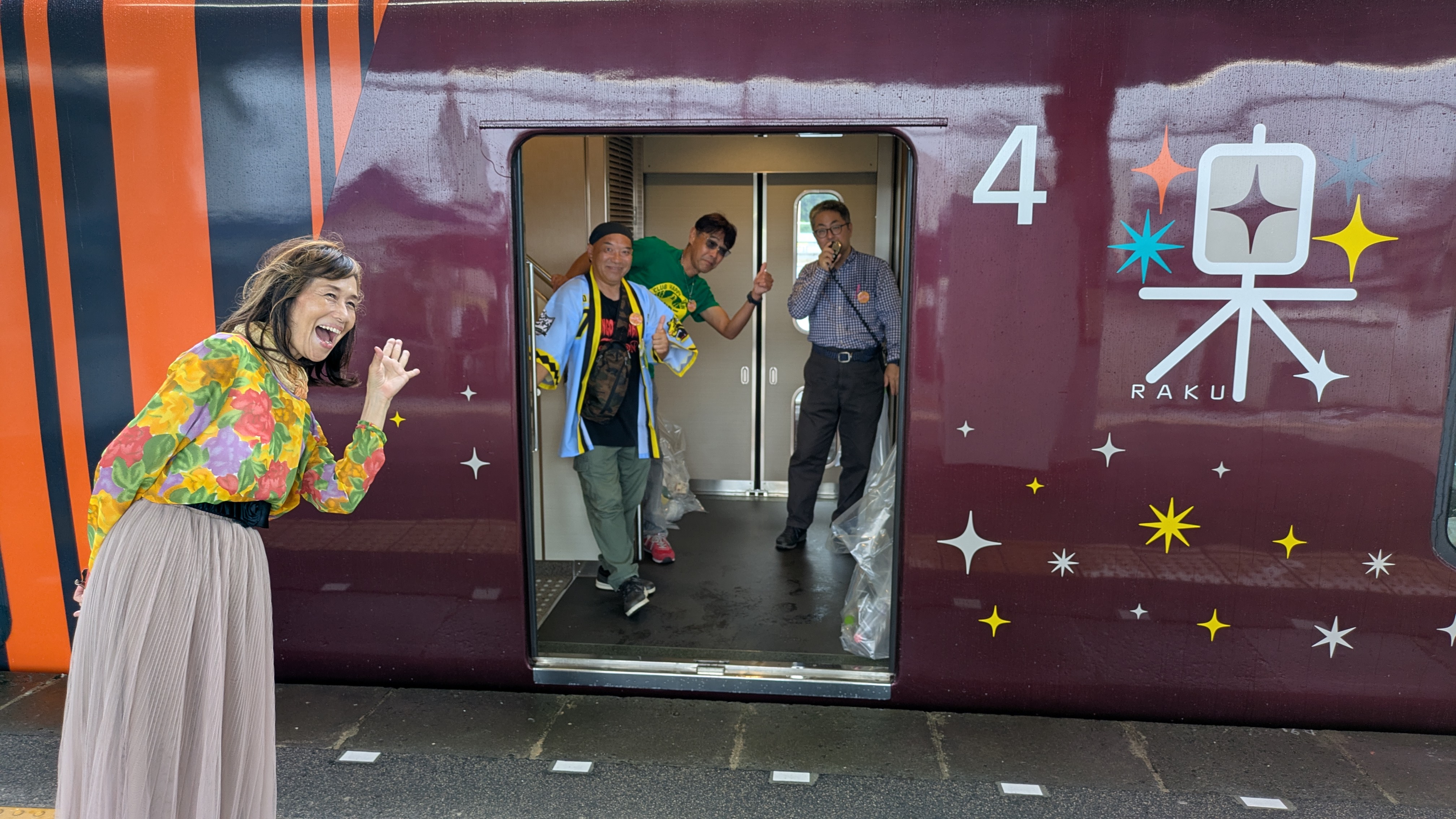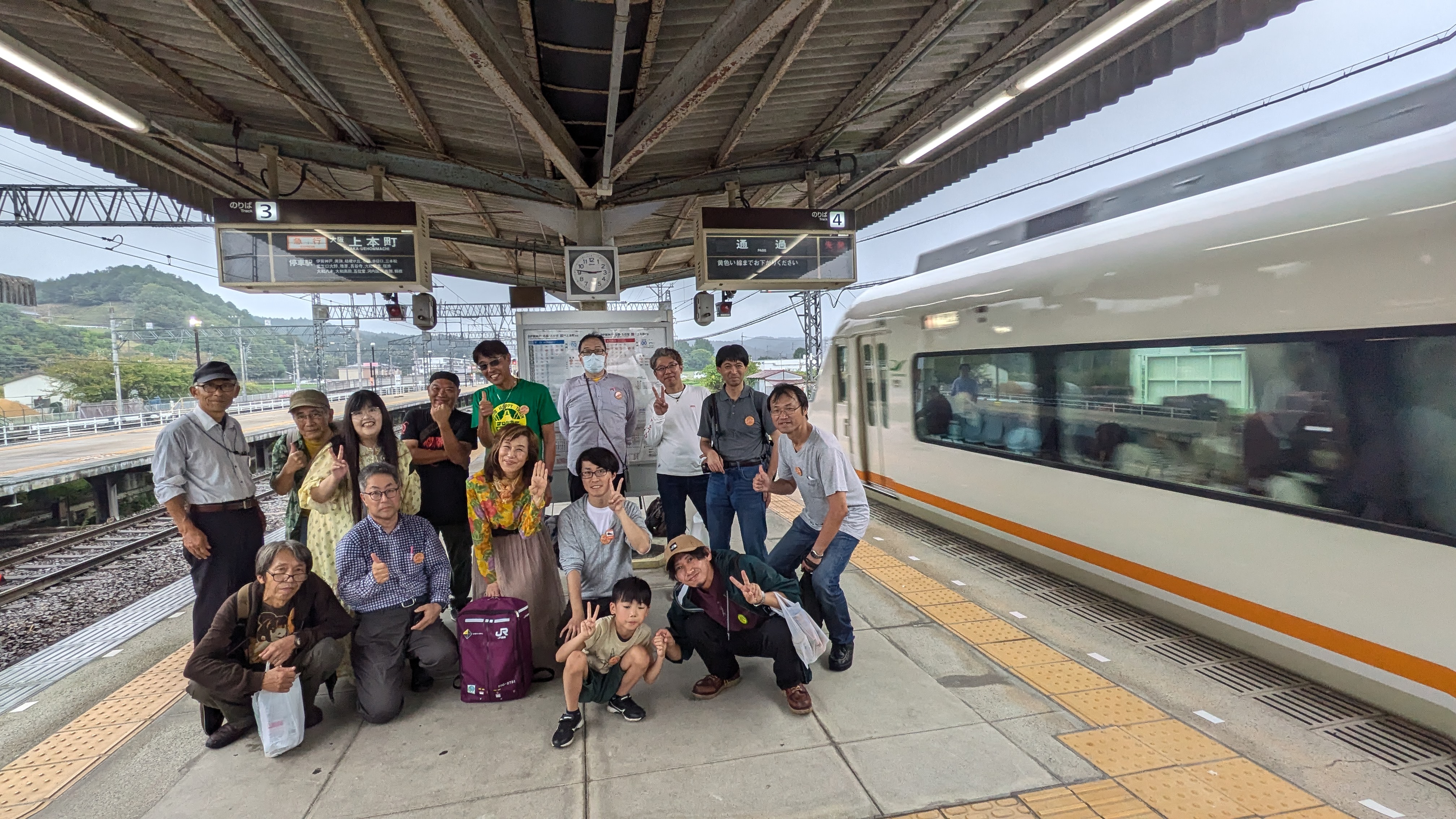 56人の皆様と全員は難しかったですが、たくさん記念写真を撮って、雨になった青山町駅で「楽」をお見送り。
