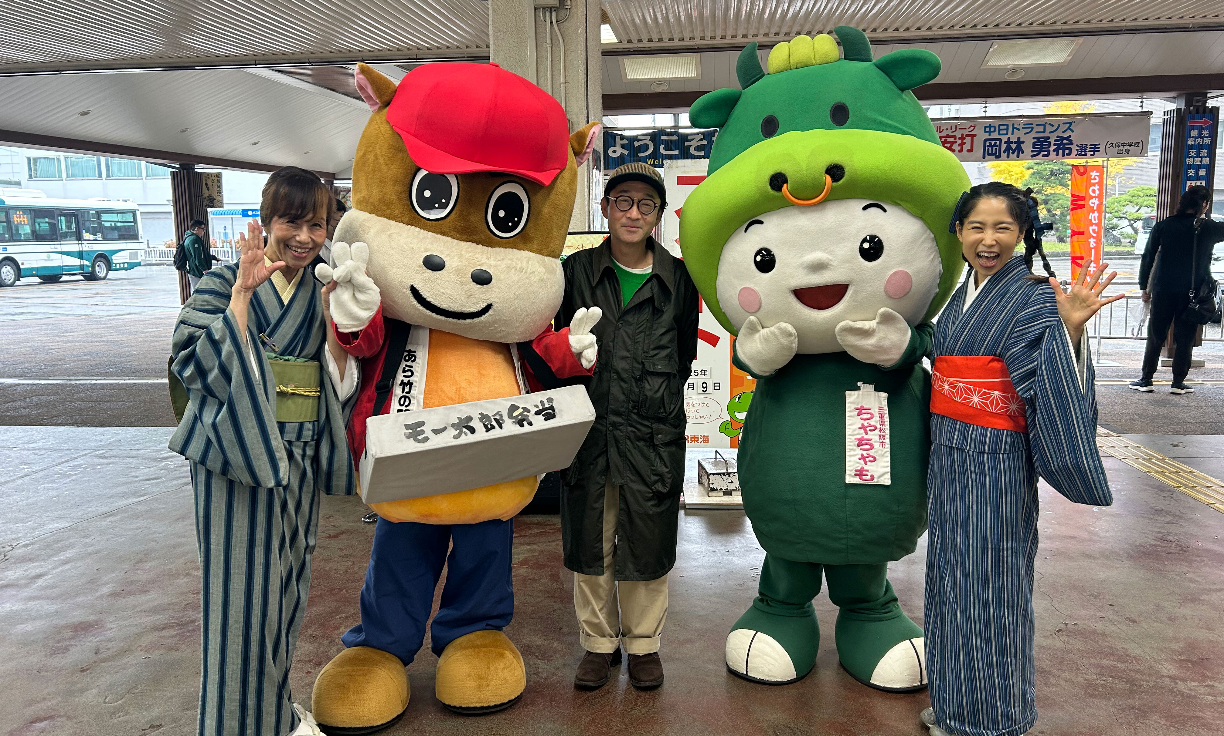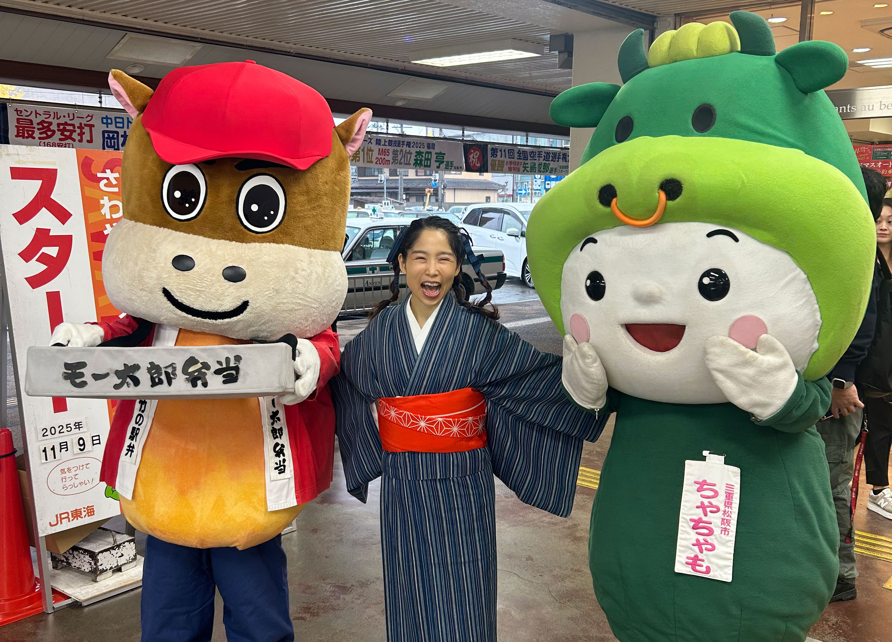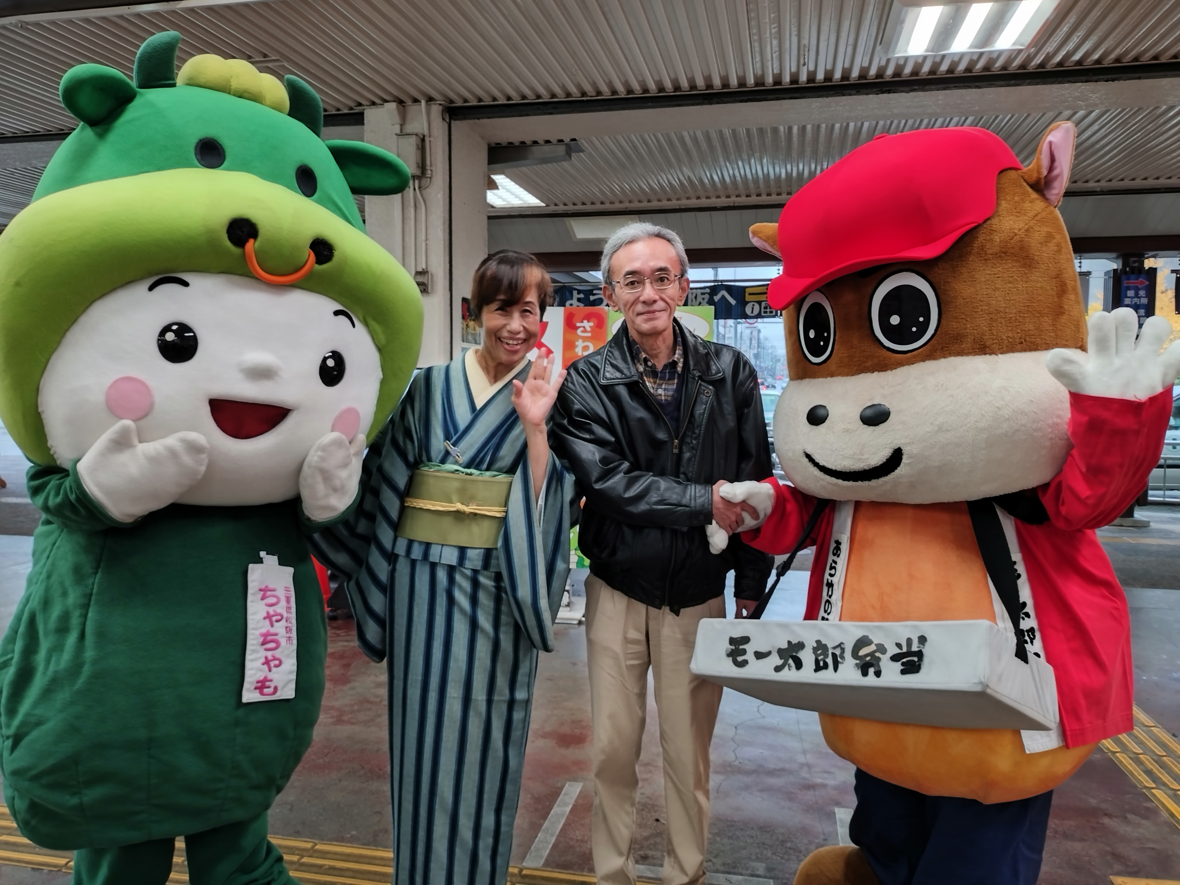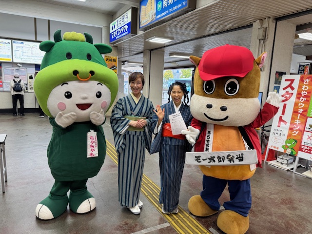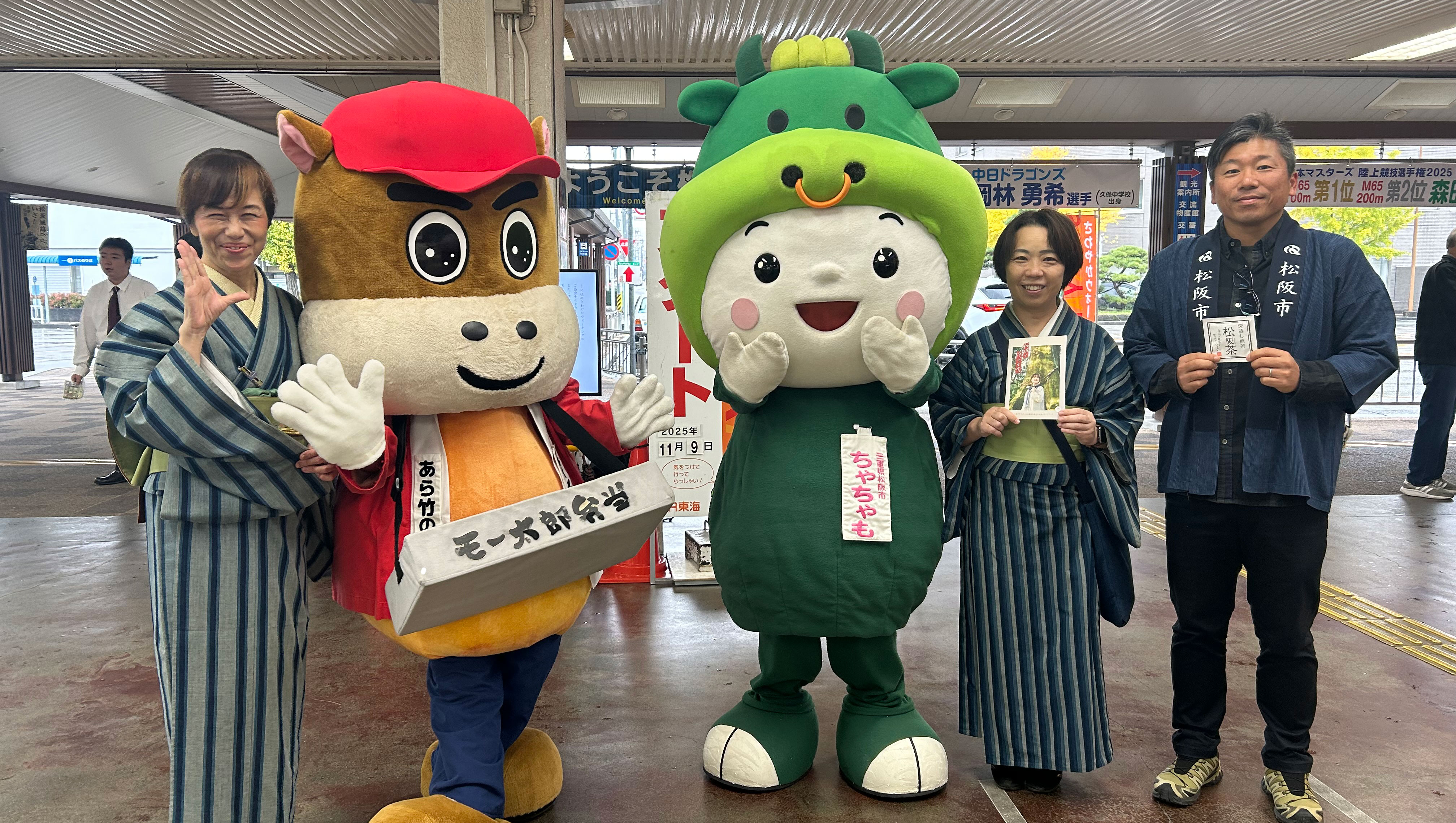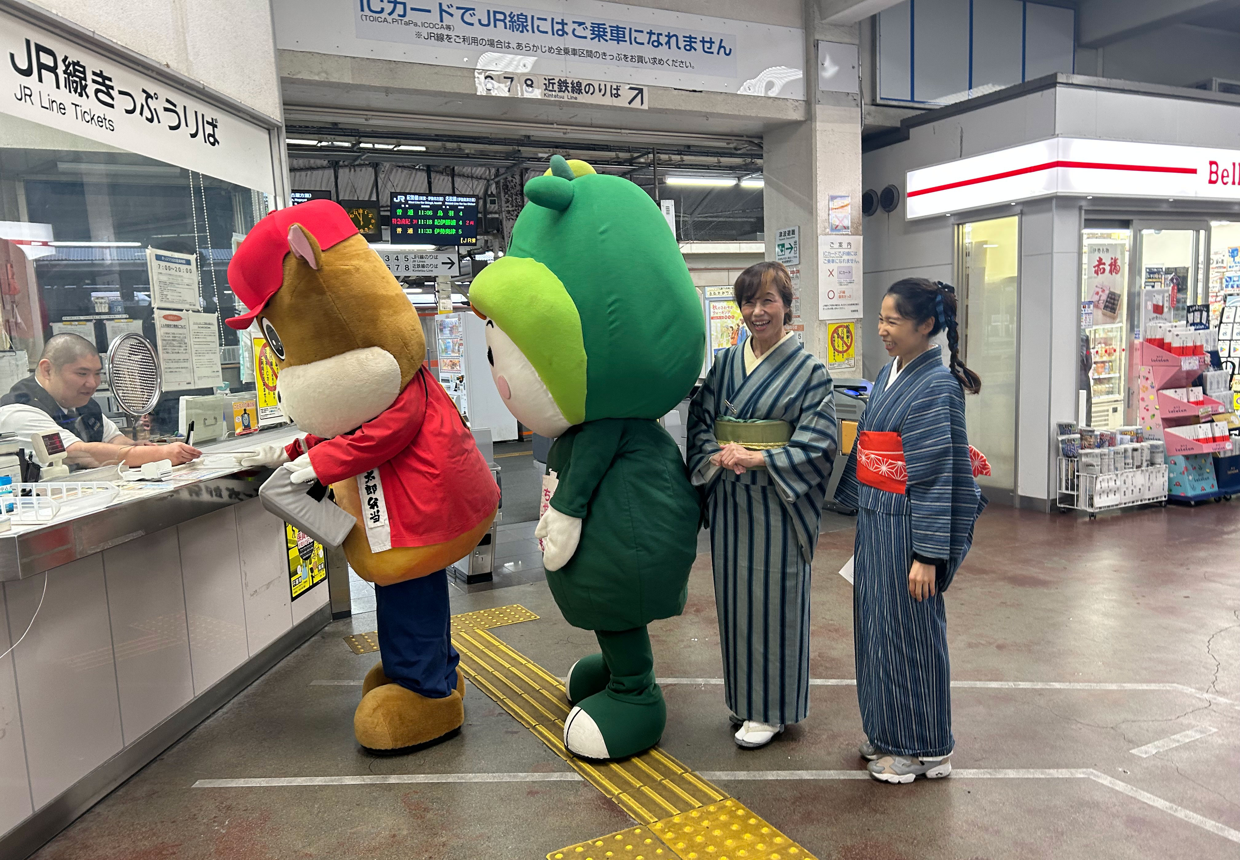 松阪駅でぴー&みーも、松阪もめんの着物姿でご参加いただくみなさまを全力の愛でお出迎えを!!