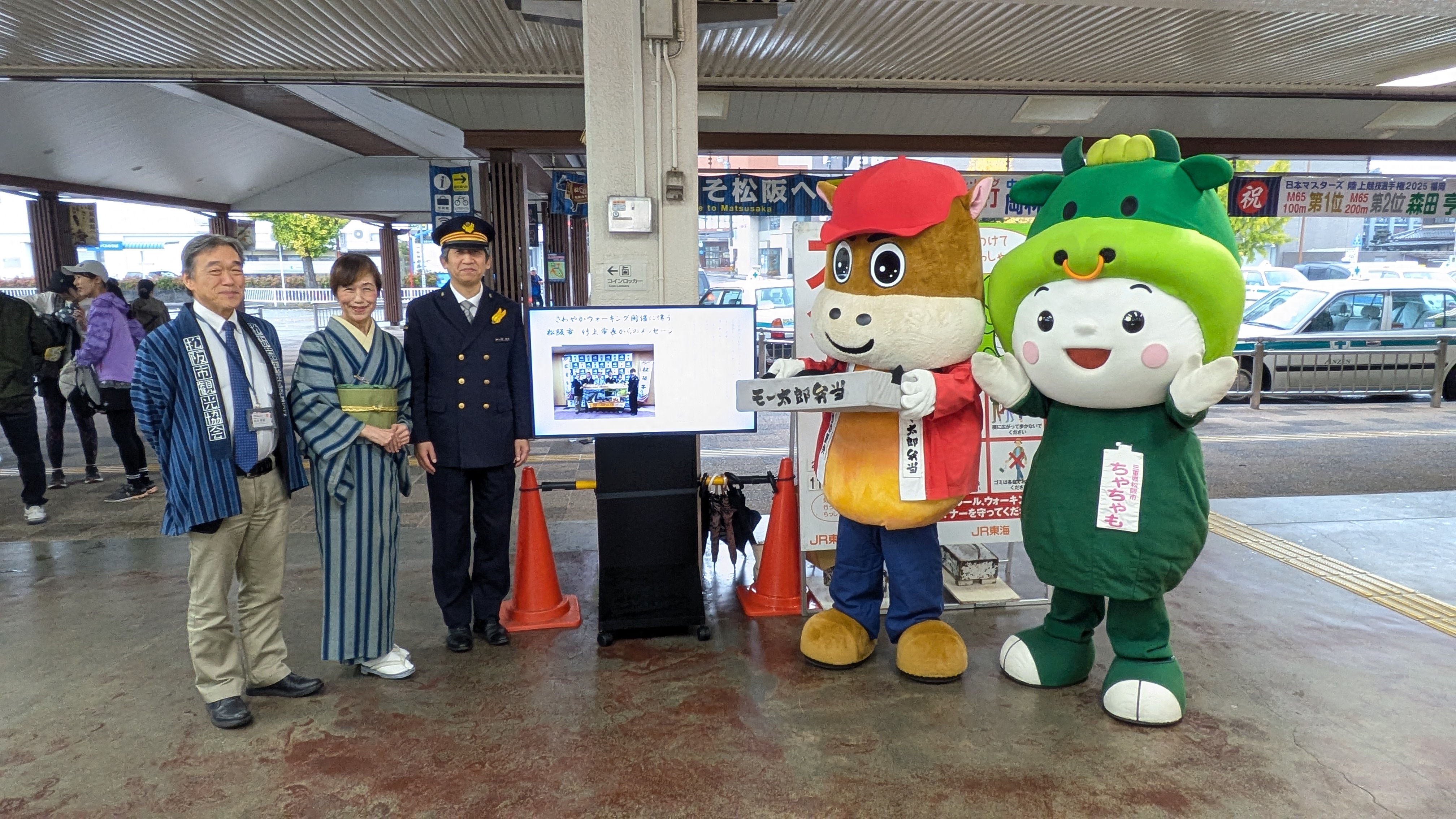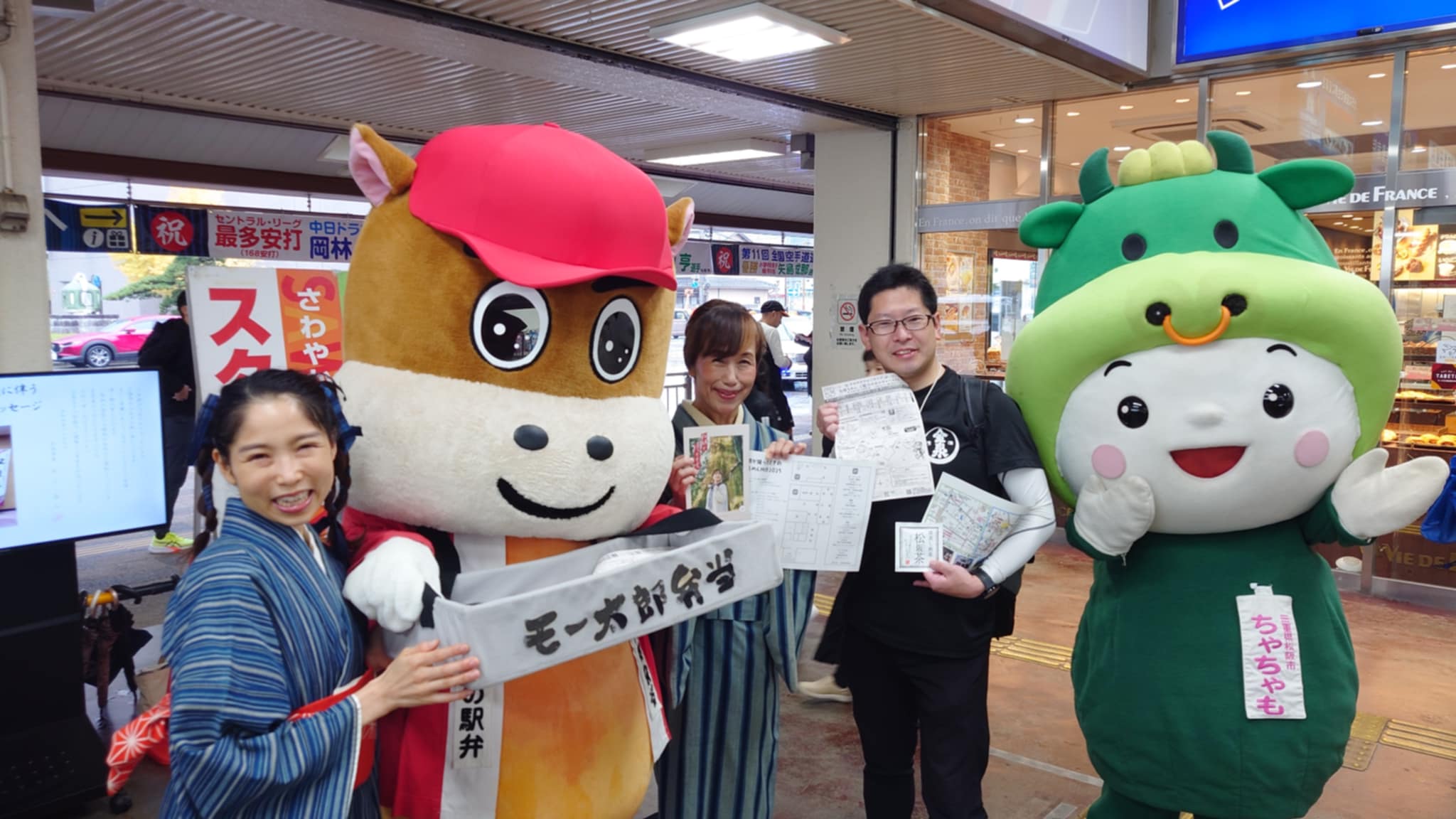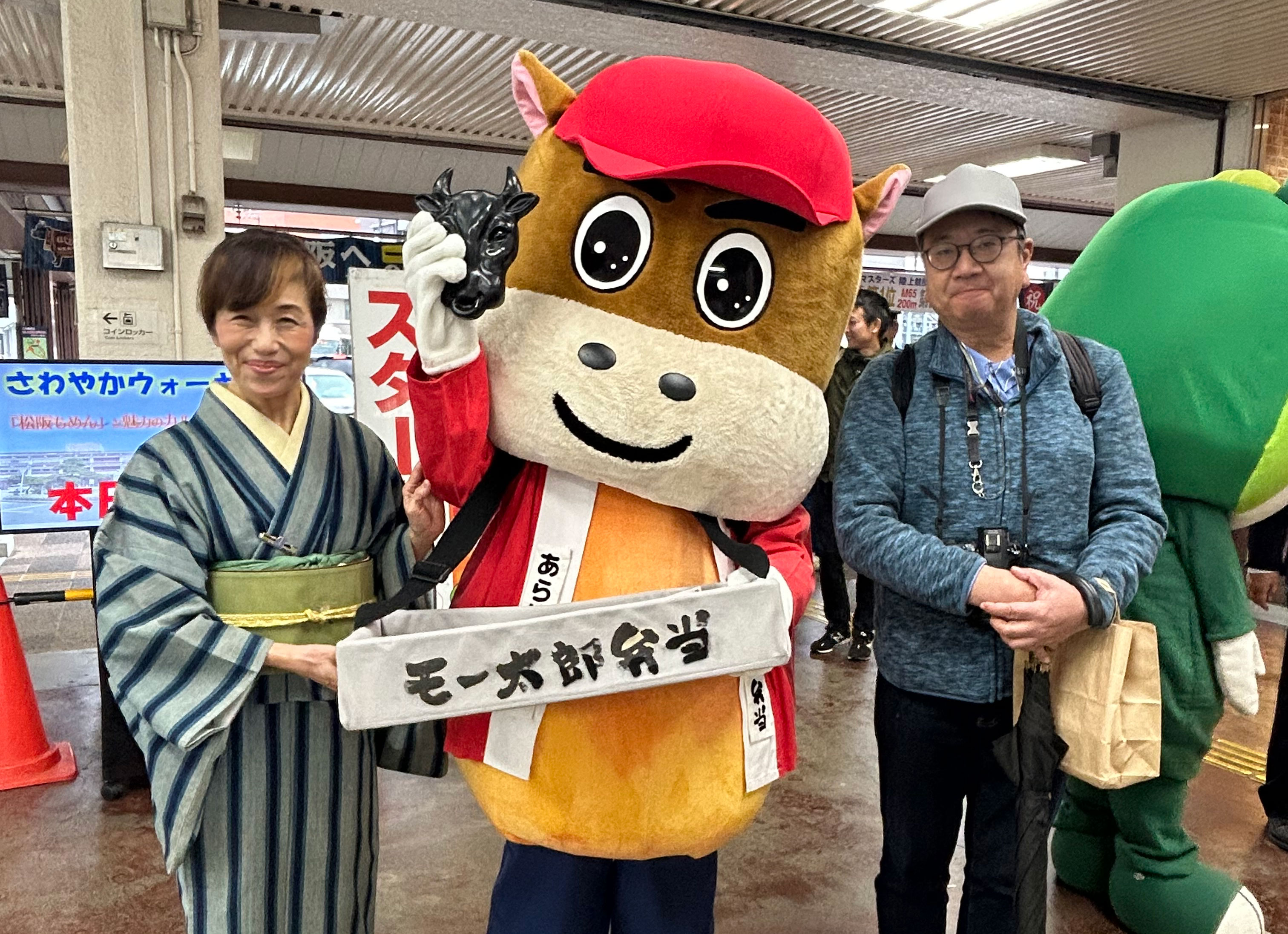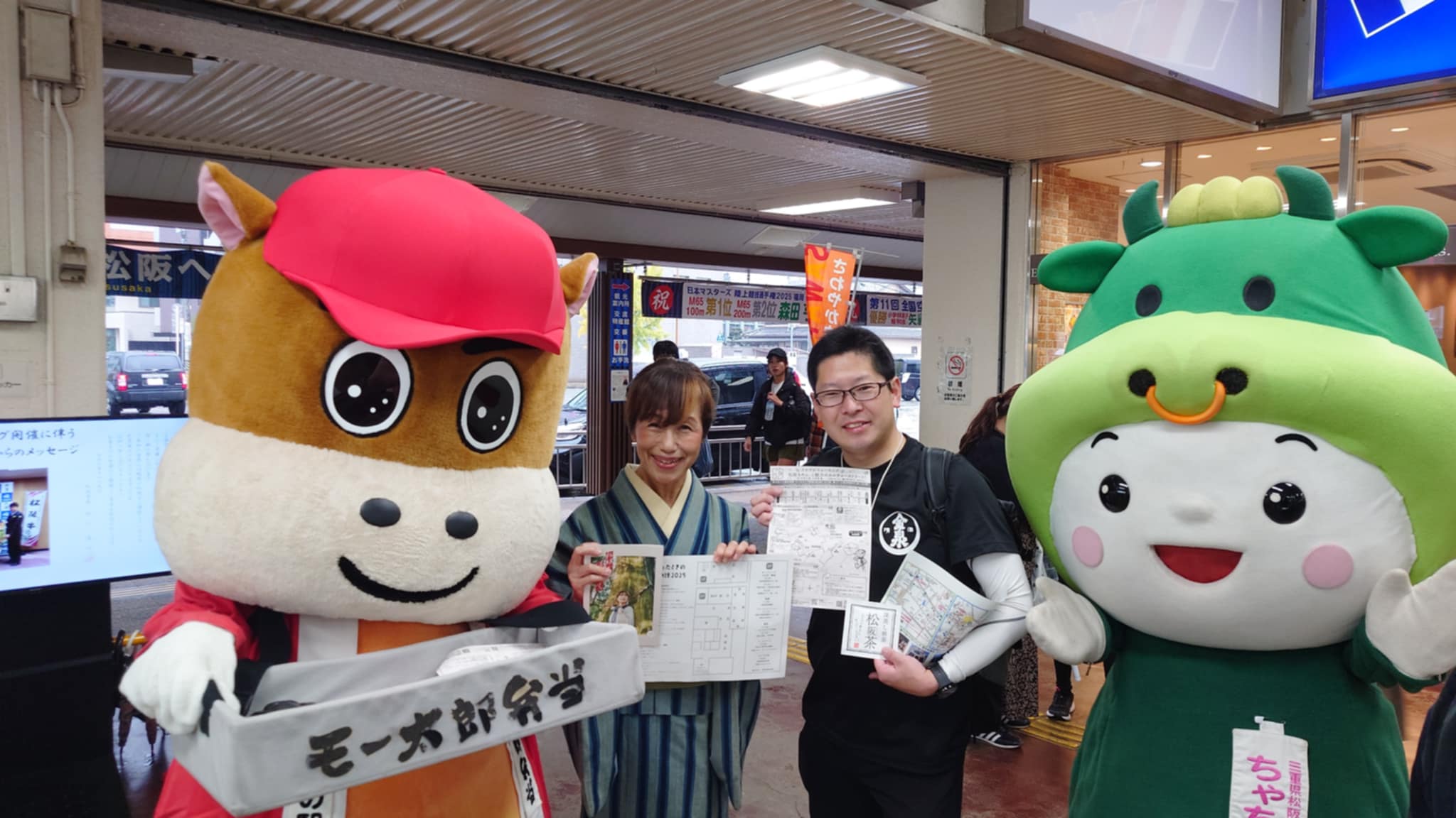 松阪駅でぴー&みーも、松阪もめんの着物姿でご参加いただくみなさまを全力の愛でお出迎えを!!