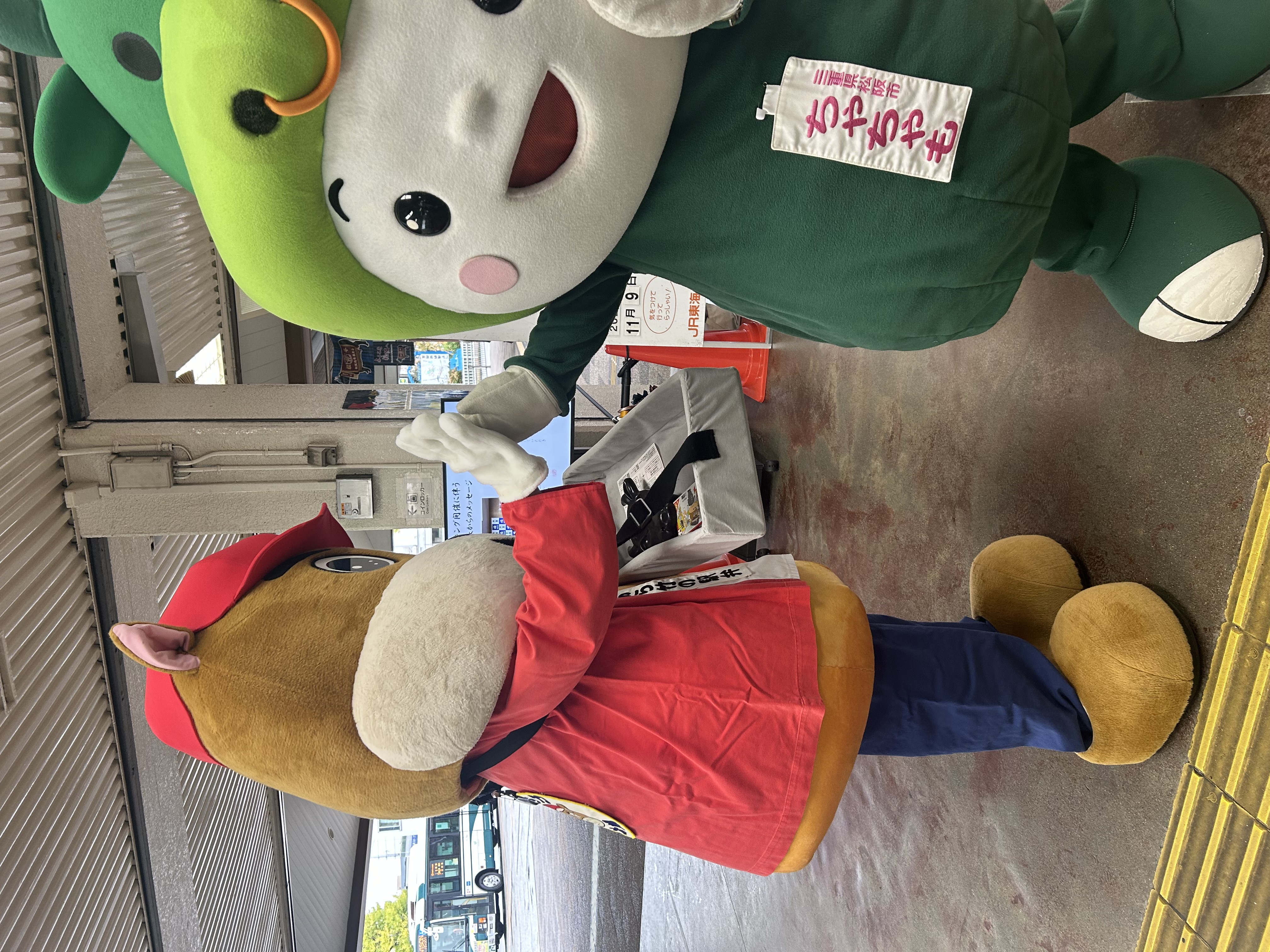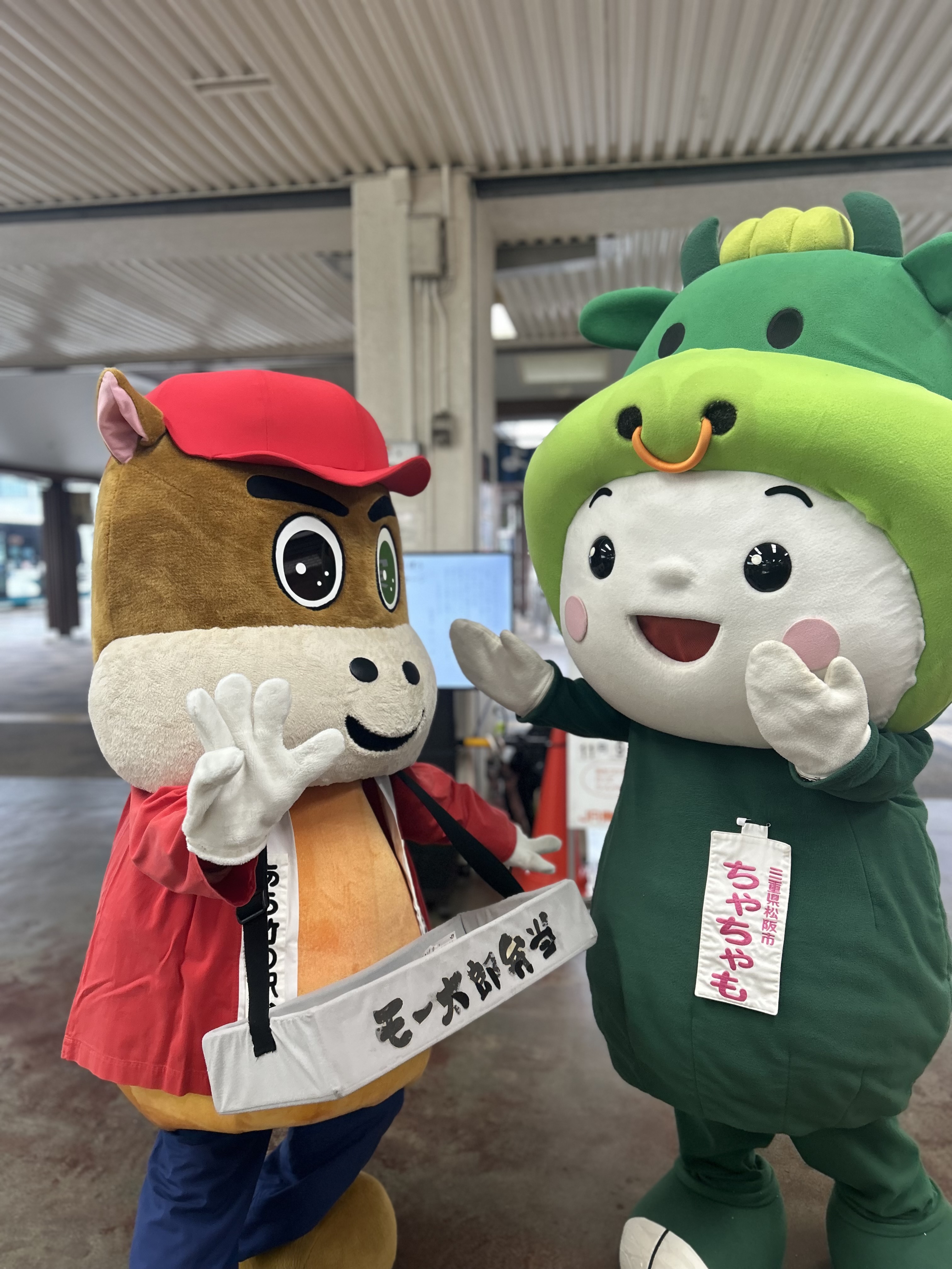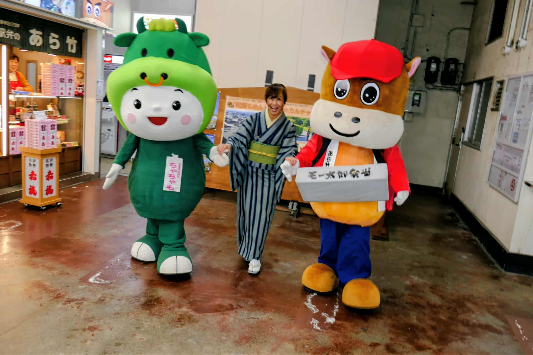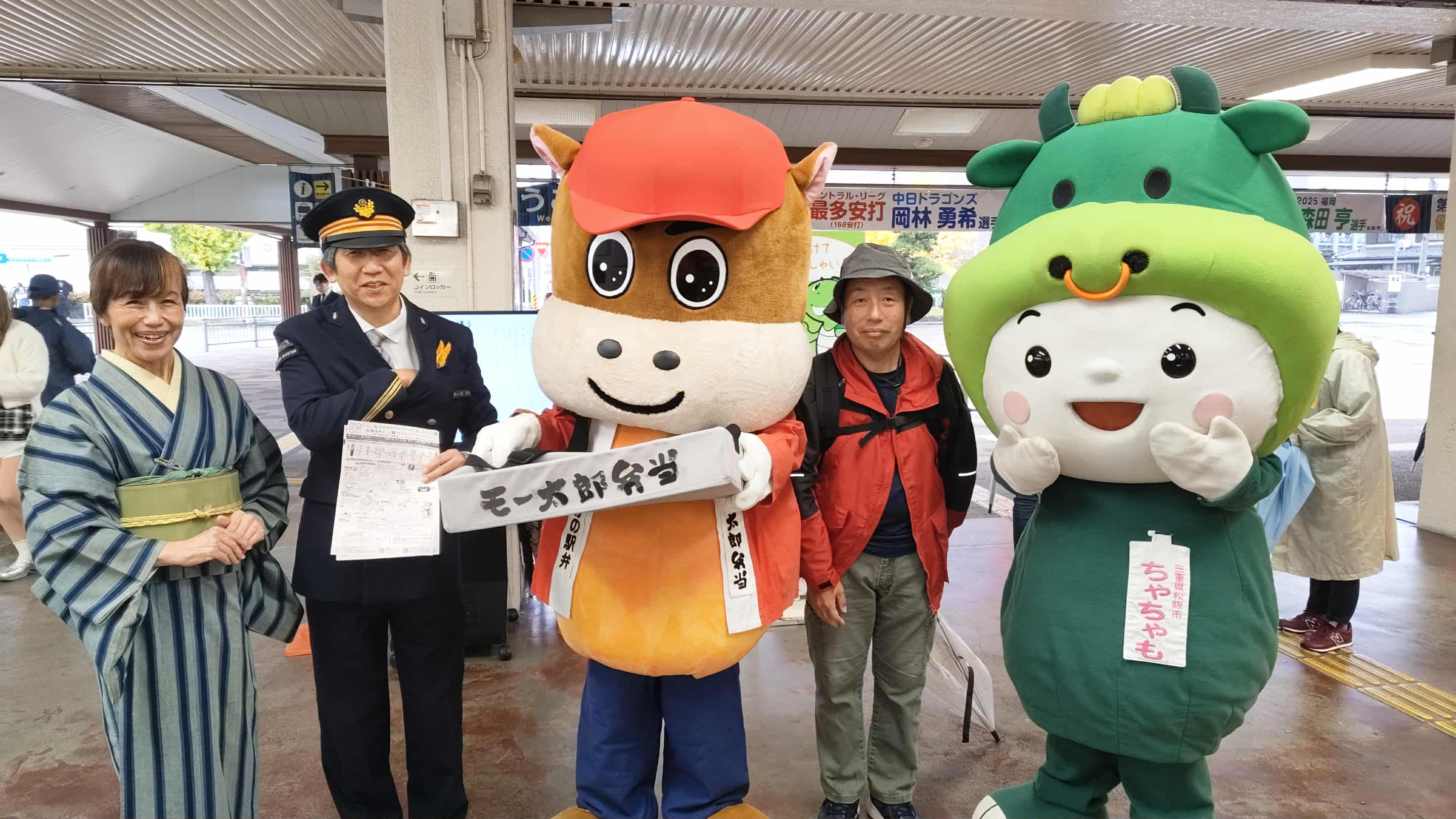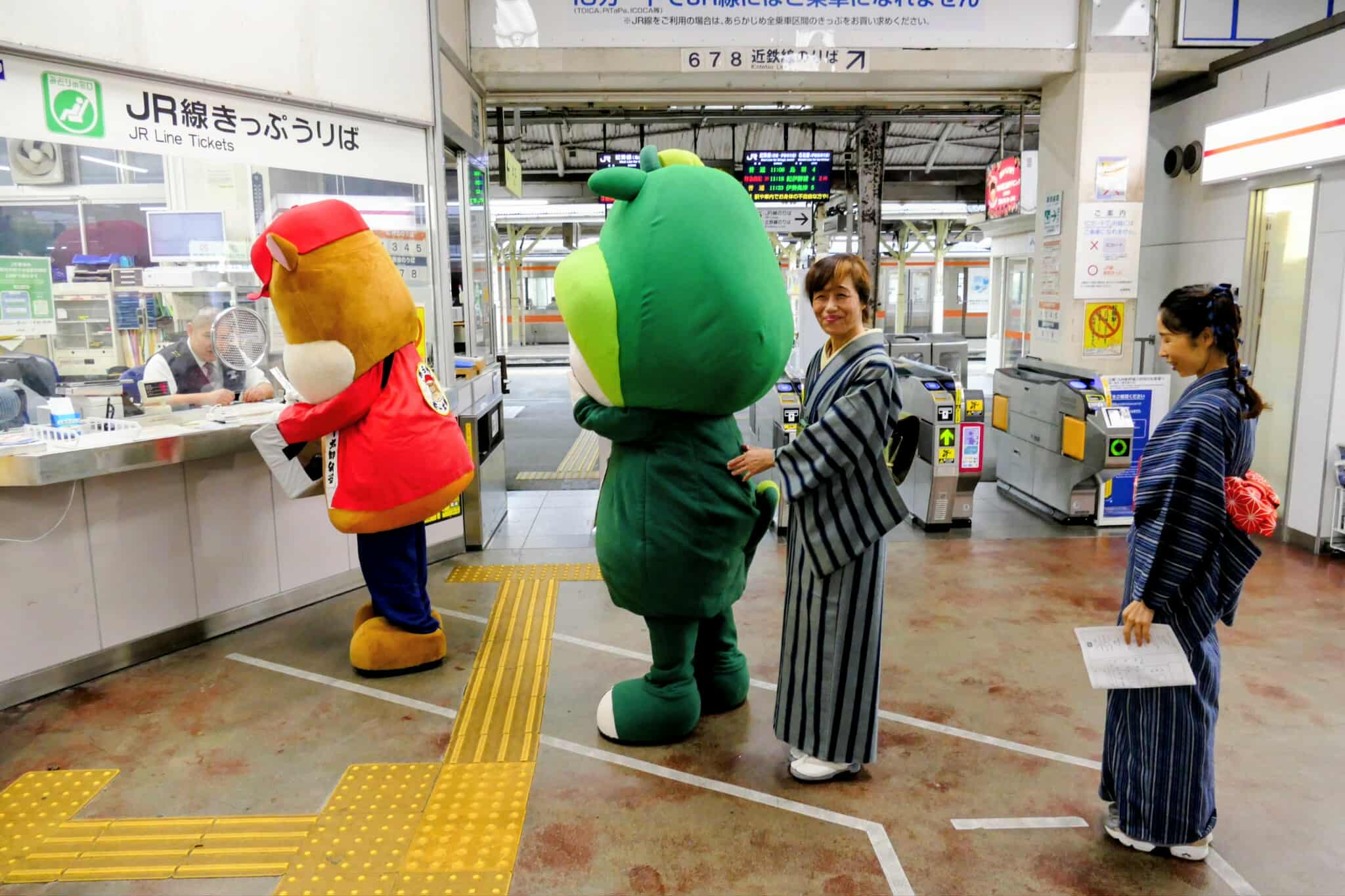 松阪駅でぴー&みーも、松阪もめんの着物姿でご参加いただくみなさまを全力の愛でお出迎えを!!
