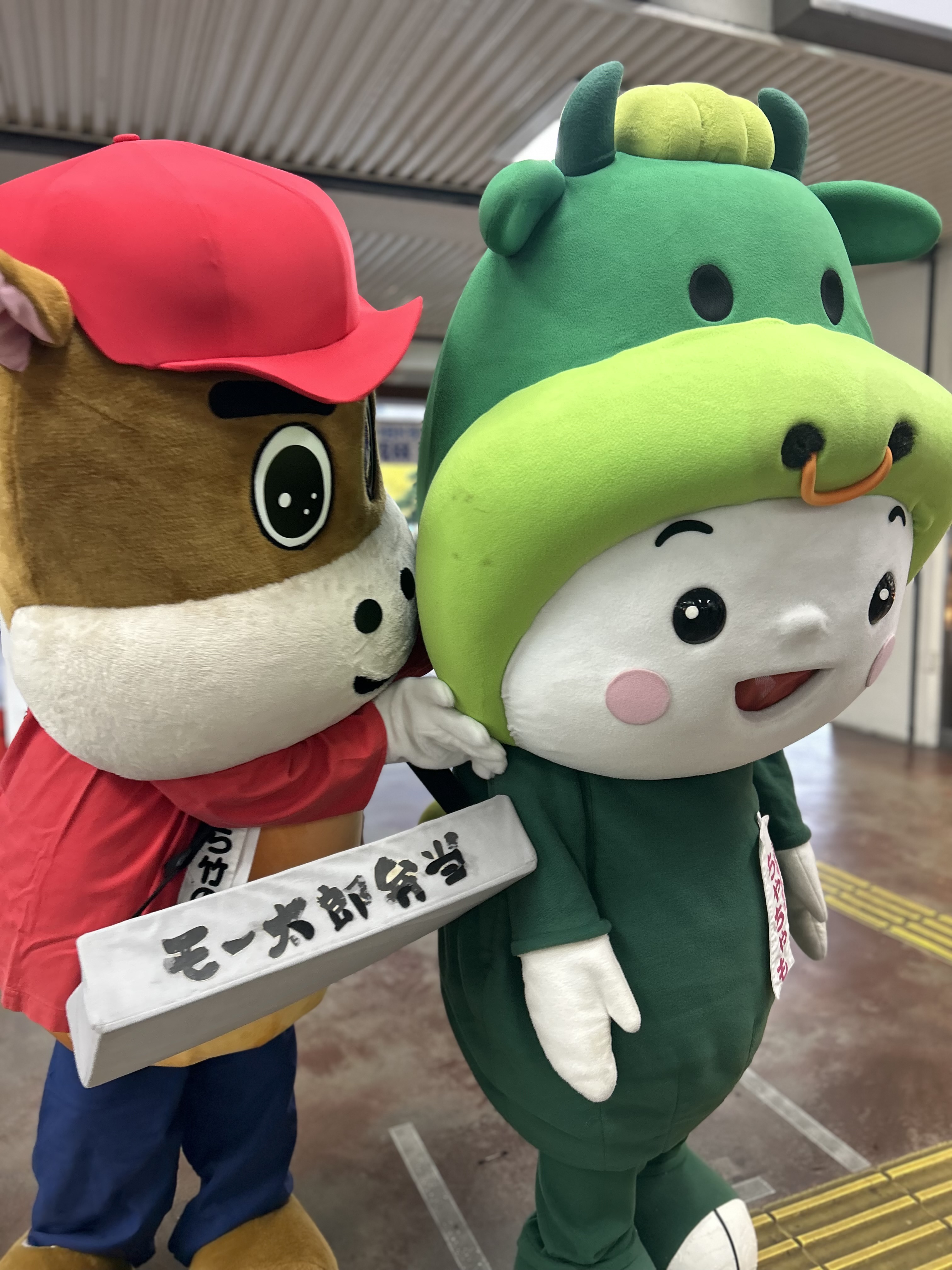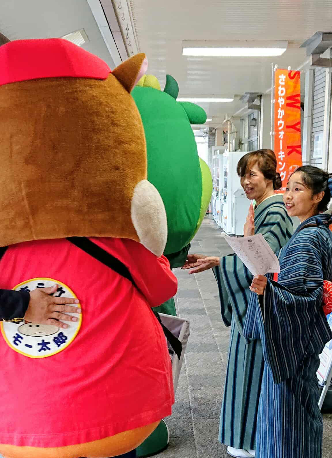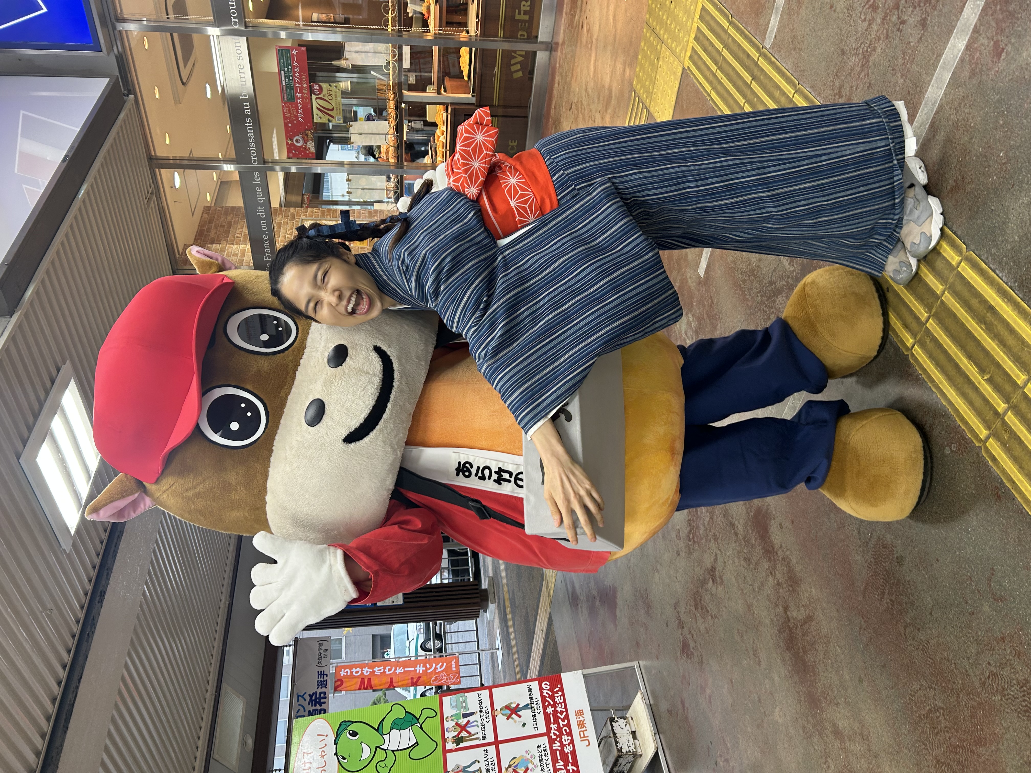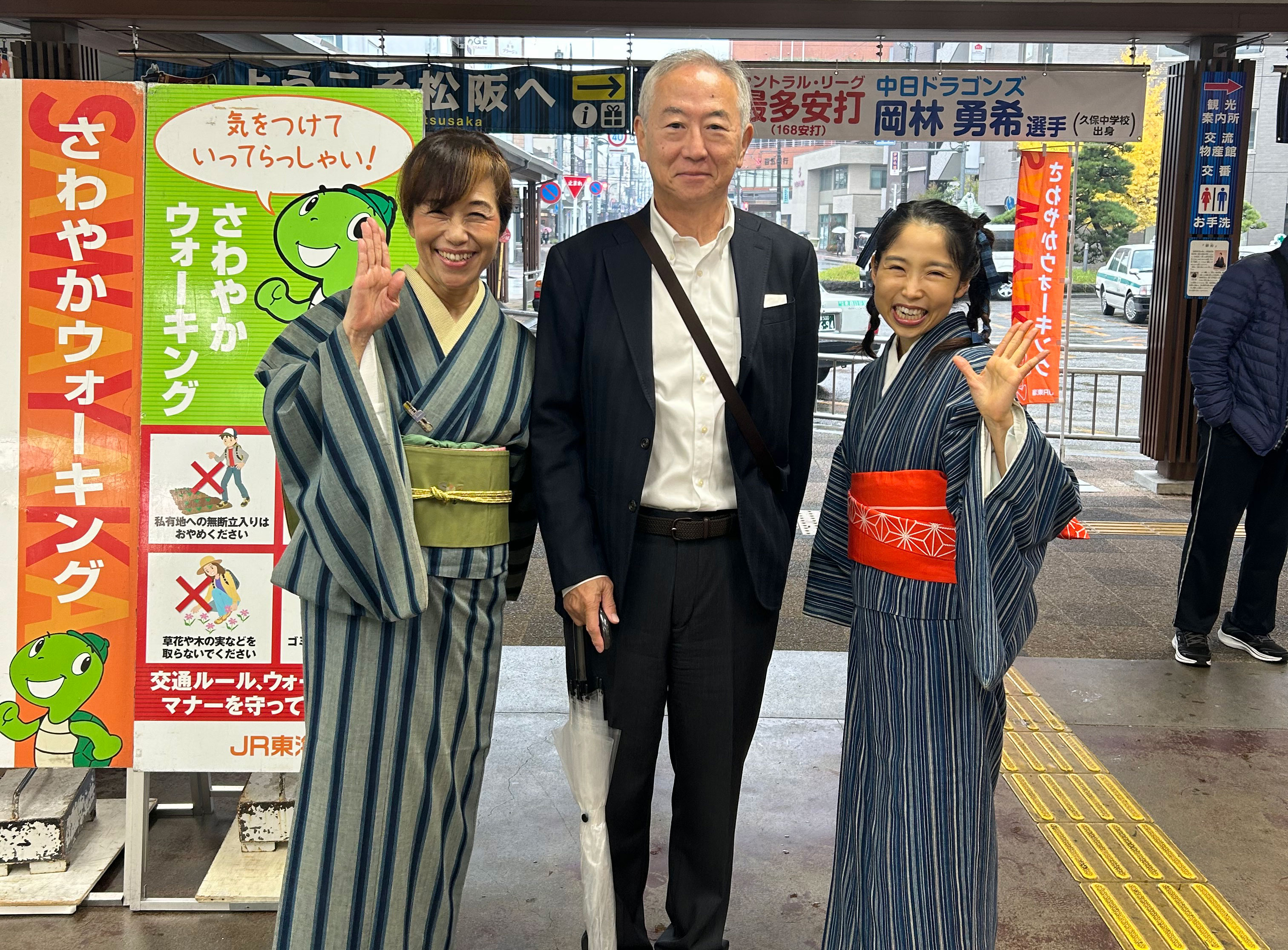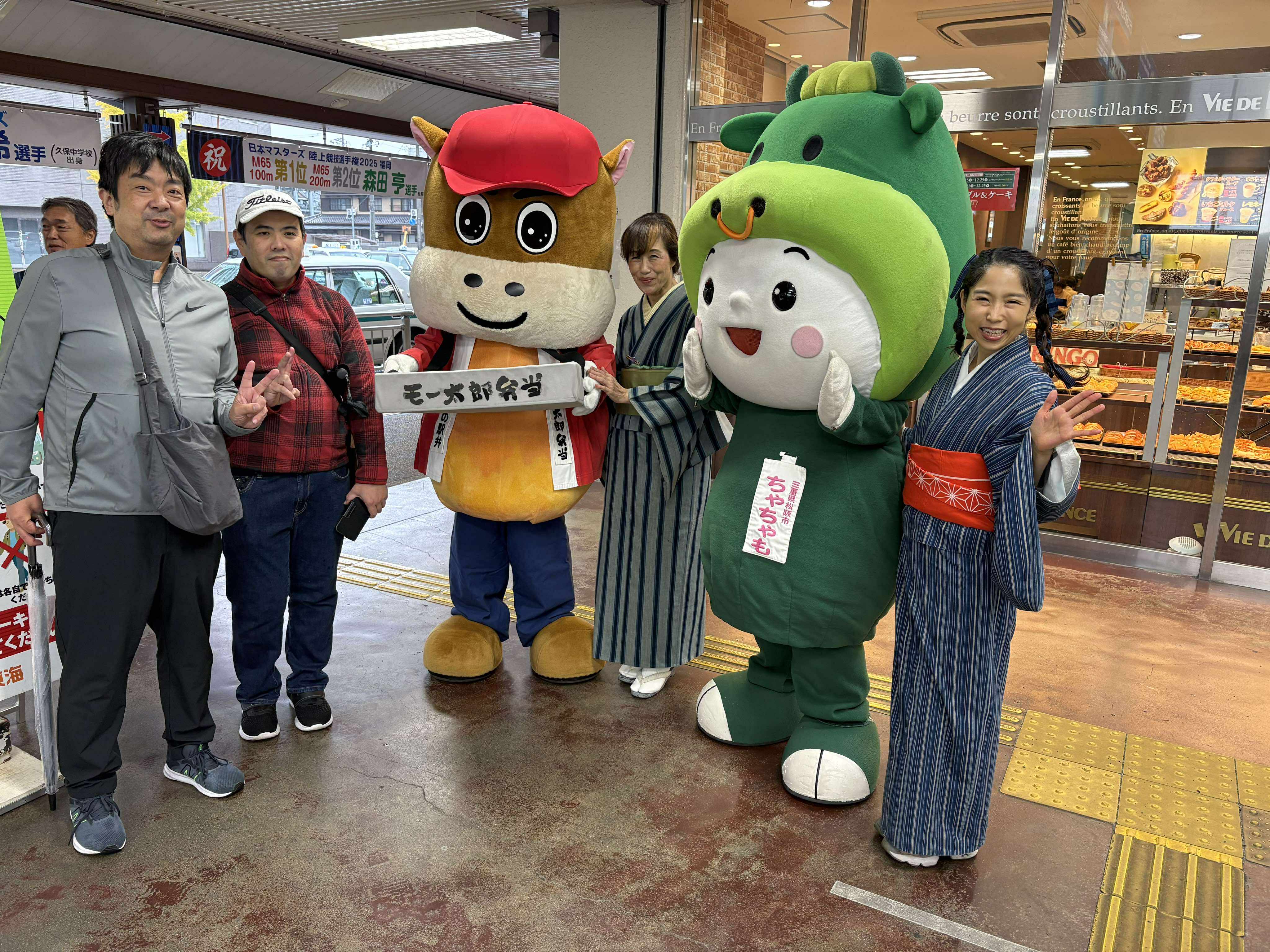 松阪駅でぴー&みーも、松阪もめんの着物姿でご参加いただくみなさまを全力の愛でお出迎えを!!