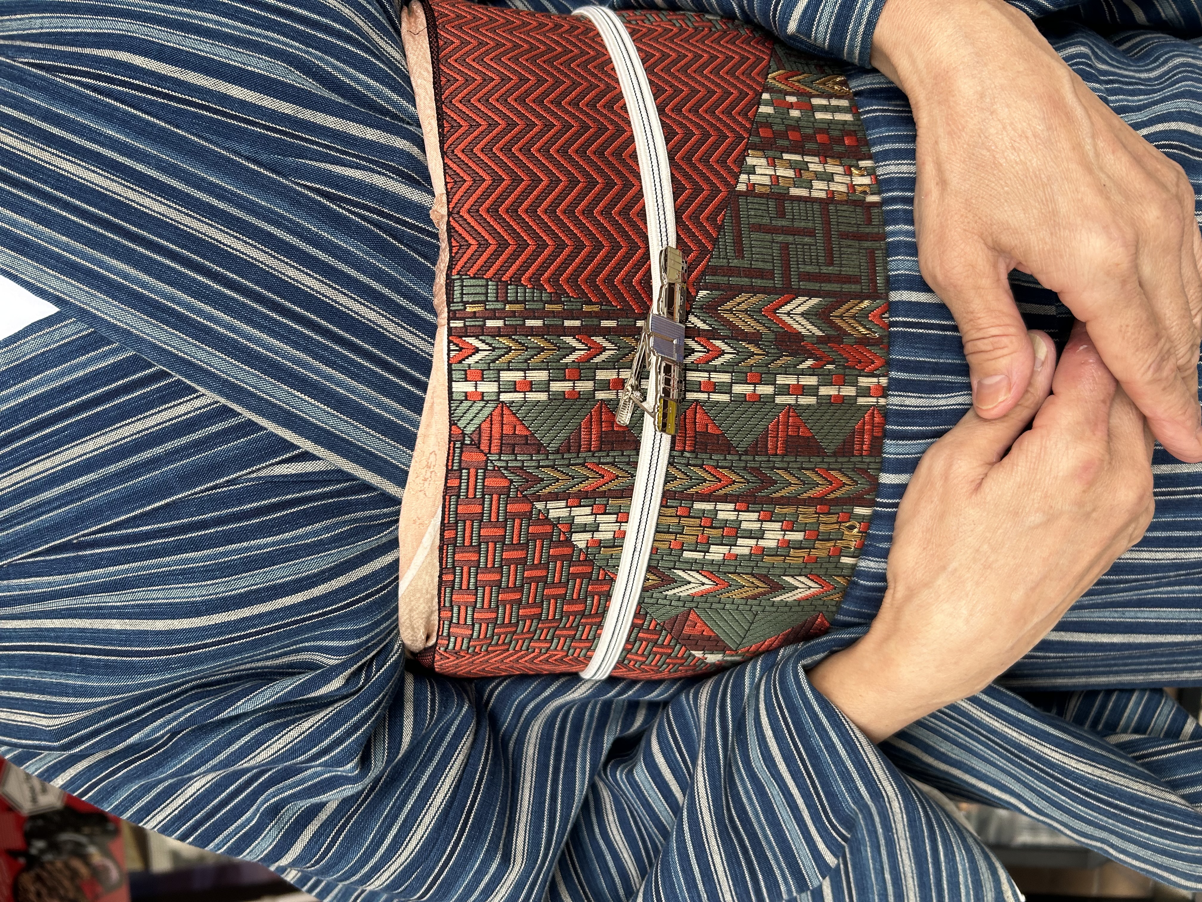 先日の「市長表敬訪問」では母の和箪笥からチョイスのベトナム風の織の朱色名古屋帯、ぴーちゃんらしくJR東海オリジナルネクタイピンを帯留めに~~