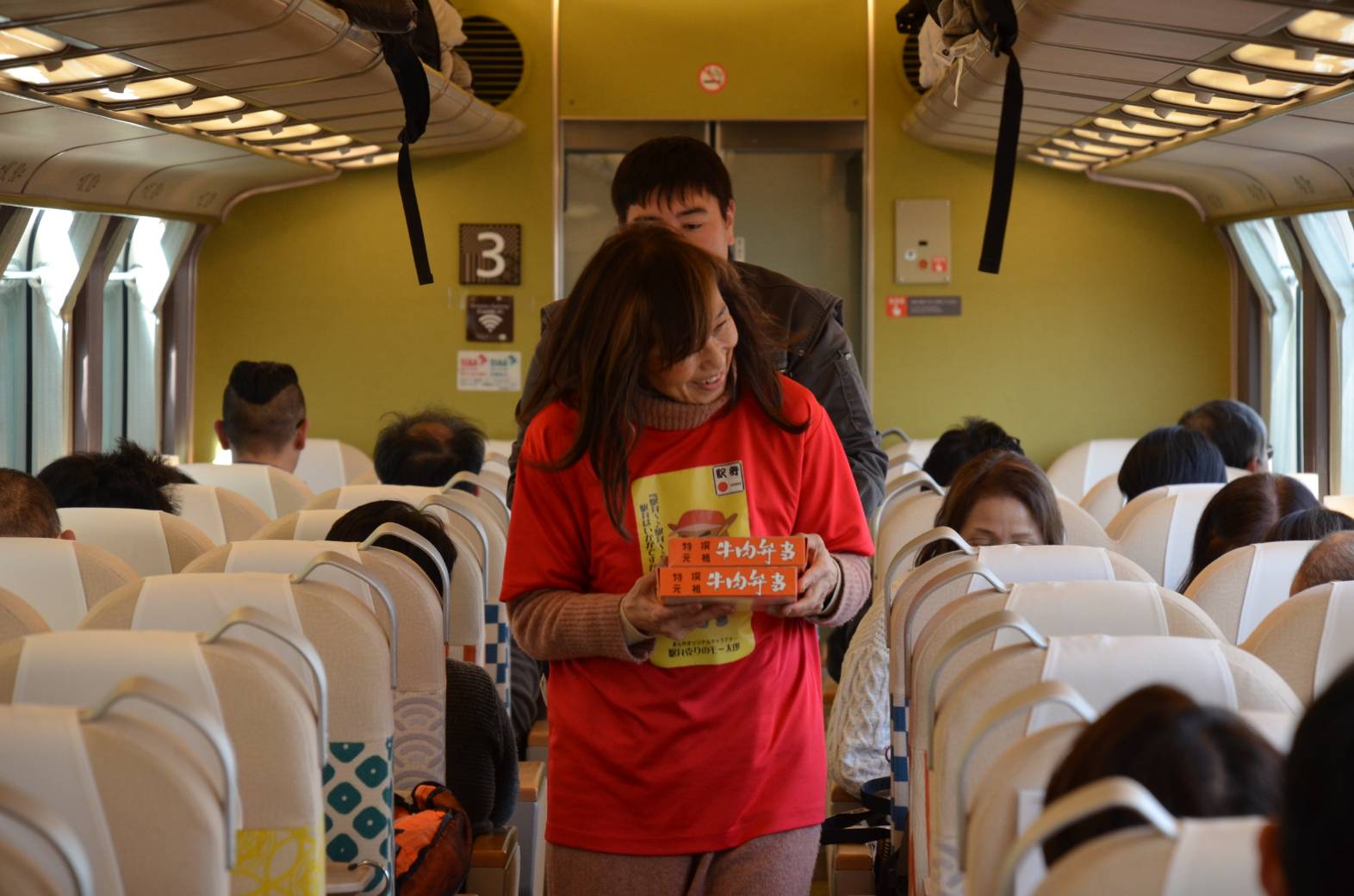 車内でおひとりおひとりに「駅弁のあら竹」の魂のこもった昭和からの名物駅弁を丁寧にお手渡し。