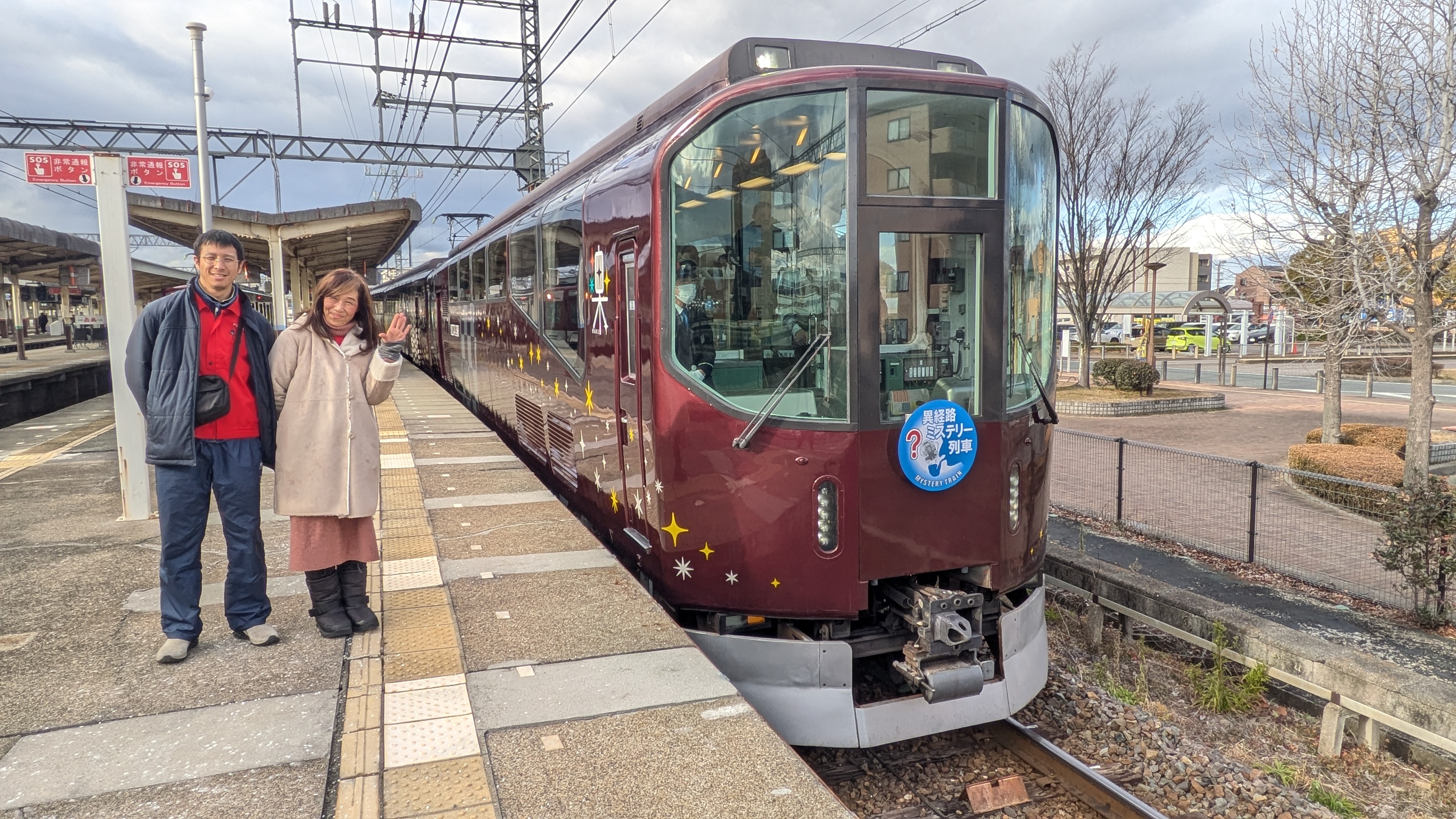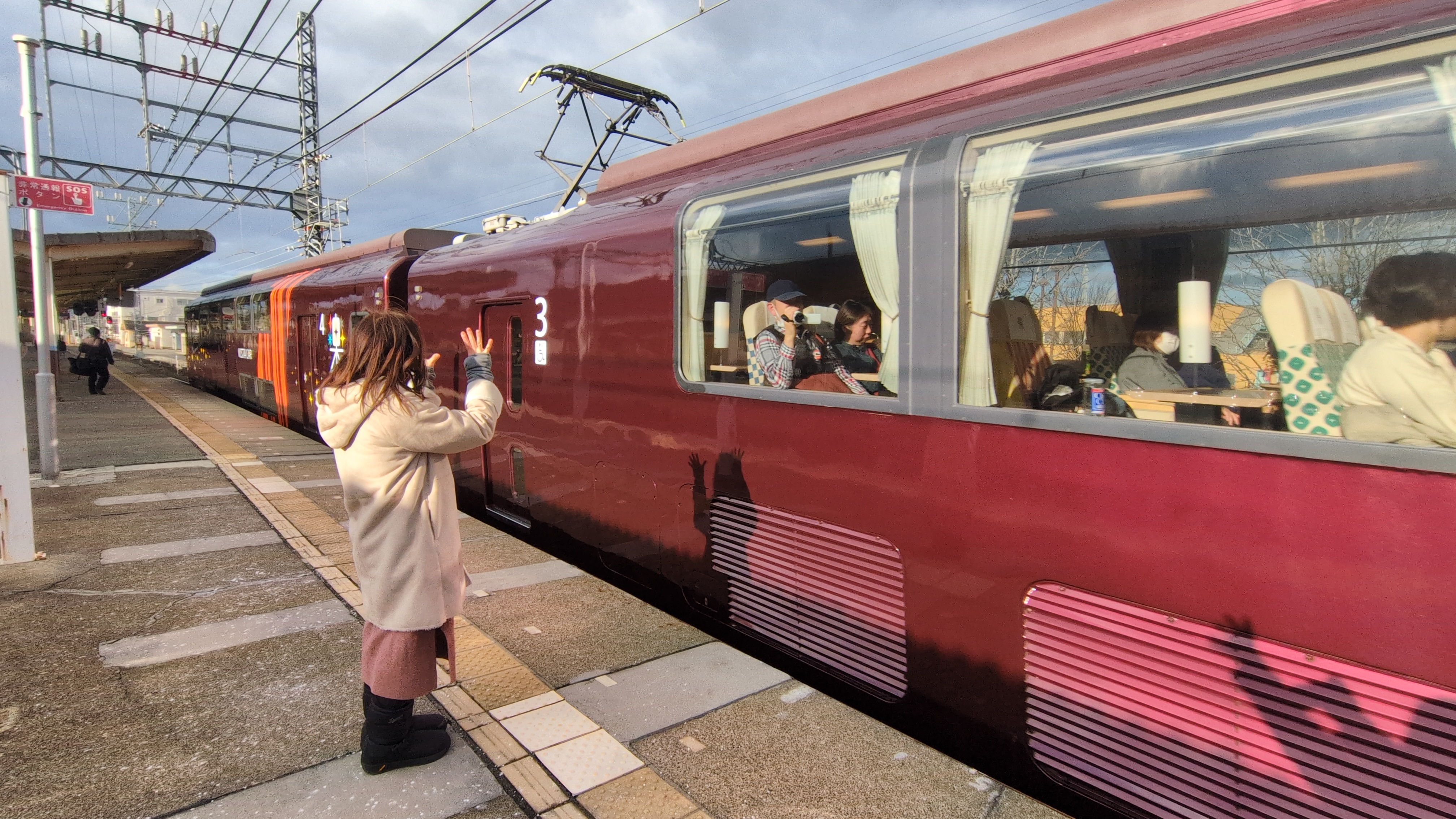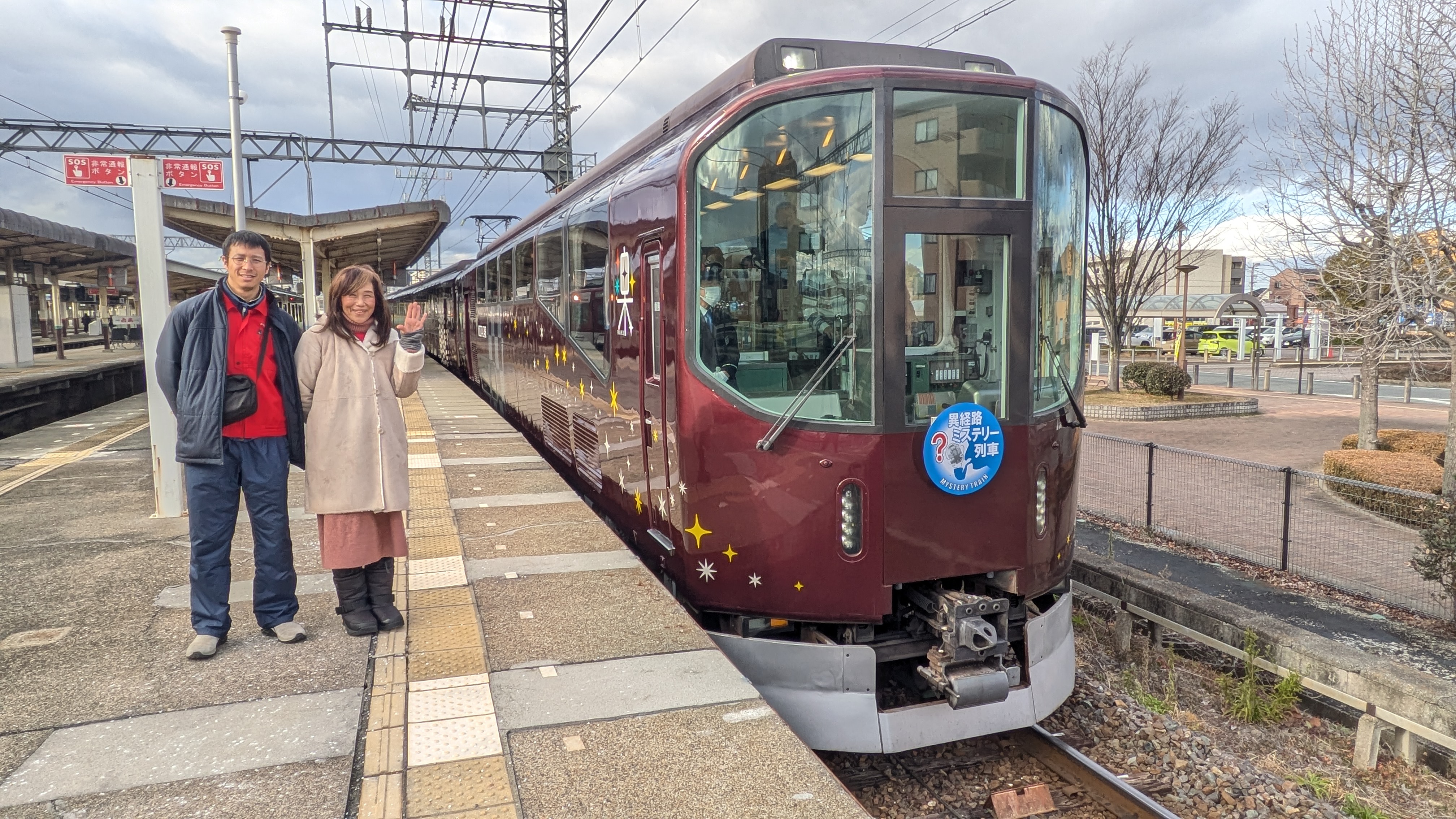 ここ数日の激寒波襲来で、粉雪の舞う名張駅で皆様の乗るヘッドマークつきの「楽」に合流。。。。