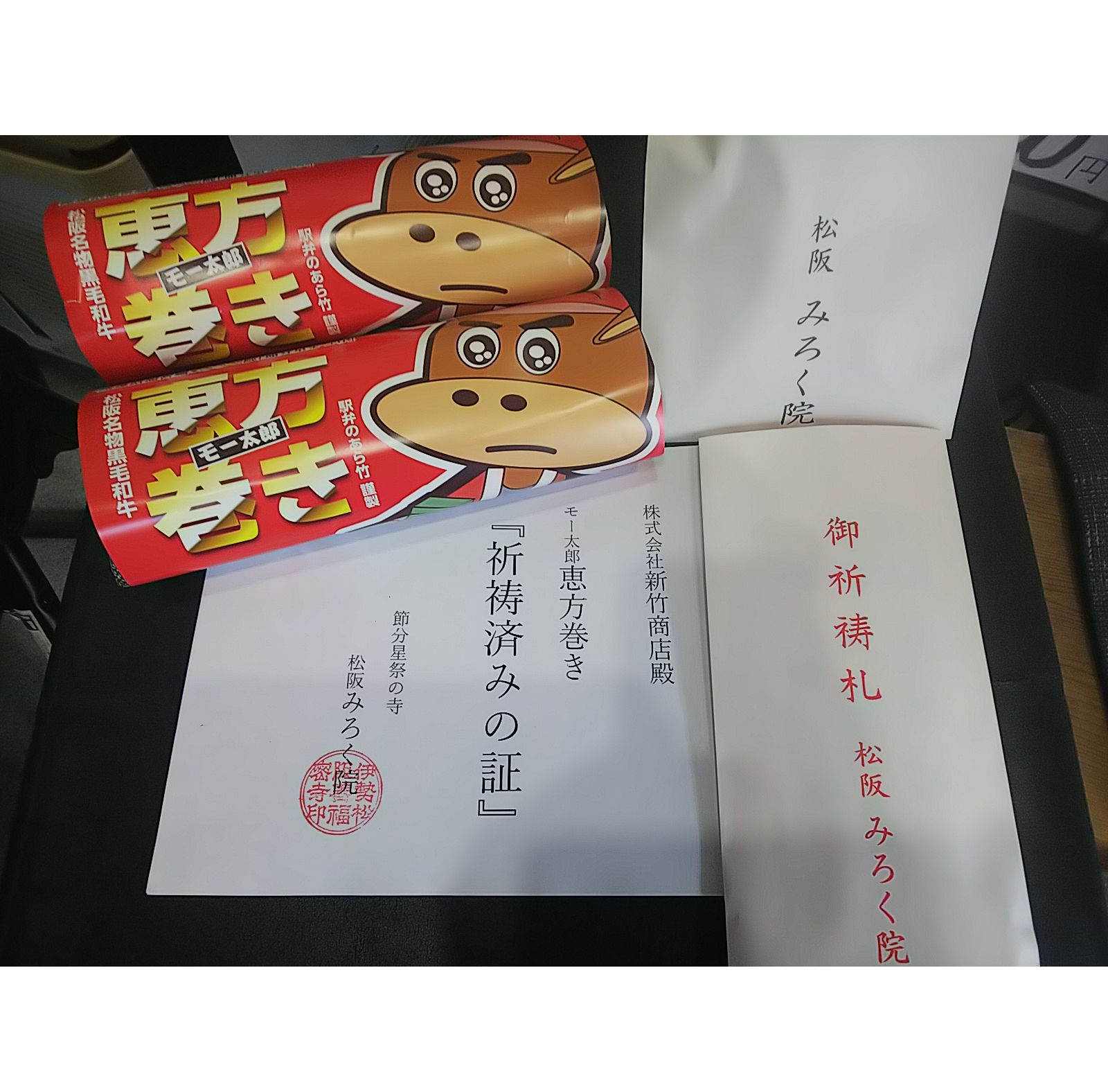 毎年恒例、松阪の街のみなさまになじみの深い「金生山みろく院善福寺」さまに開運招福のご祈祷をいただきました「モー太郎恵方巻き」